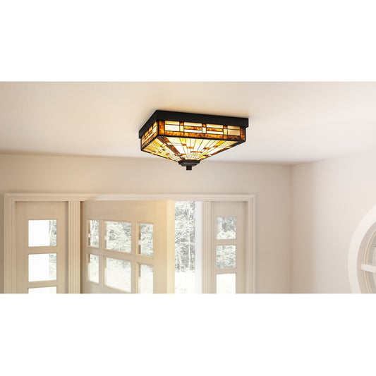 Quoizel Legend 2 Light Flush Mount, Matte Black/Multicolor Art Glass