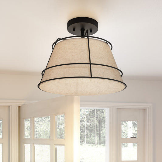 Quoizel Burbidge 1 Light Semi-Flush Mount, Matte Black/Cream Linen