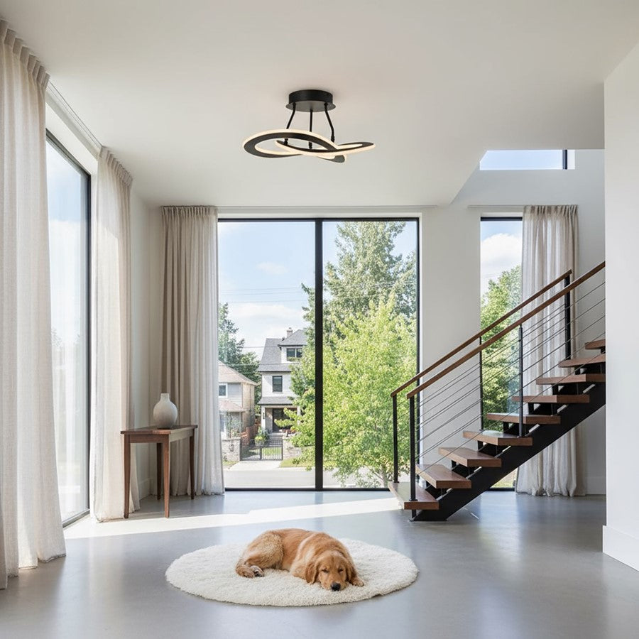 The "Wave Collection" is named after its curvy organic design. A perfect addition to any modern to transitional setting. The chandelier is finished in a semi gloss black and is suspended by aircraft type cables. It is illuminated by bright energy saving LED technology. This semi flush has two sizes of matching chandeliers.Hanging Length (Min-Max): 10