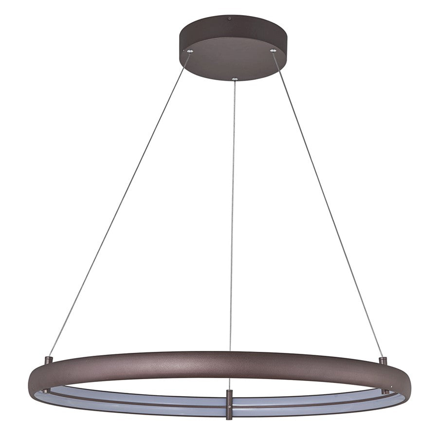 In the Sling ring pendant, available in Bronze or Titanium Silver, aircraft cable mounting points feed power to the fixture, eliminating the unsightly power cord for a seamless look. The fixture has a high-power lumen output and is dimmable with 0-10v dimmers. Supplied with 10 feet of aircraft cable for flexibility in installation, Sling ring pendant would provide a modern touch installed above a dining room table. Supplied with a 0-10v driver.
