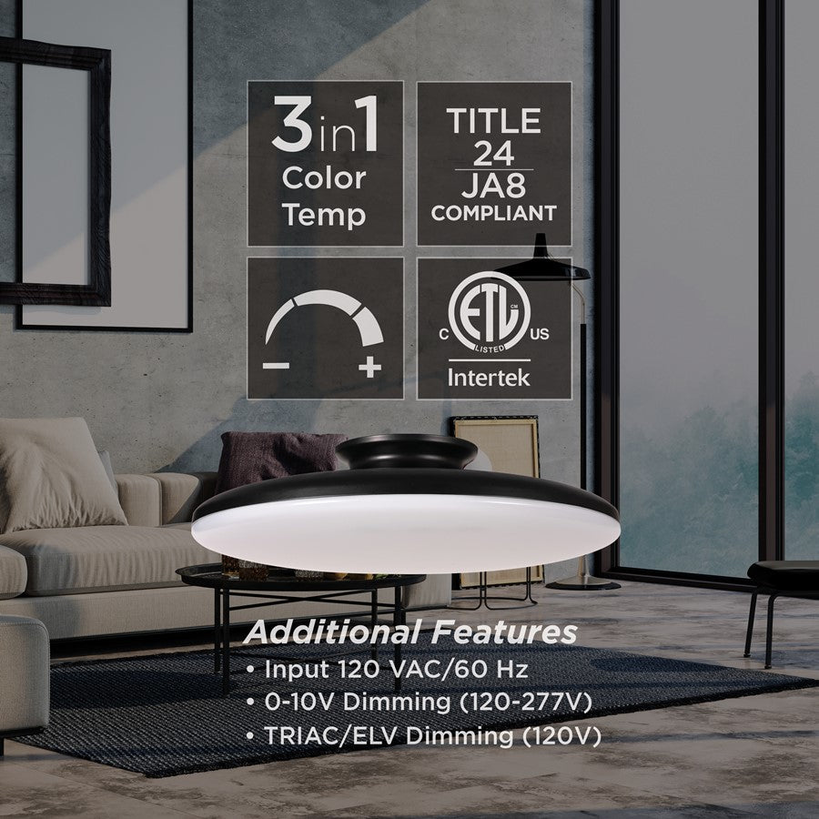 Part of the Skye CollectionFinish: Satin NickelMade of SteelShade Finish: WhiteShade Made of AcrylicColor: Satin Nickel/Nickel/Silver/WhiteShade Shape: RoundStyle: TransitionalIntegrated LED Bulb(s)(1) 33W LED Bulb(s)Bulbs IncludedBulb Color Temp: 3000K/3500K/4000KBulb Average Hours: 50,000 hrs.Bulb Lumens: 2900Bulb CRI: 90Bulb Shape: Integrated LEDVoltage: 120Dimmable with the use of TRIAC/ELV dimmer (not included)DimmableSystem Type: HardwiredProduct Care: Dust with a soft dry cloth.Prop 65: WARNING: This product can expose you to lead, which is known in the State of California to cause cancer, birth defects or other reproductive harm. For more information go to www.p65warnings.ca.gov.Required Assembly: Assembly RequiredCommercial/Residential Use: Commercial and ResidentialFor Use in Damp LocationsSafety Rating: CETLus ListedWarranty Info: 5 Year limited warranty.Overall Dimensions: 4.38"(H) x 19"(Dia)