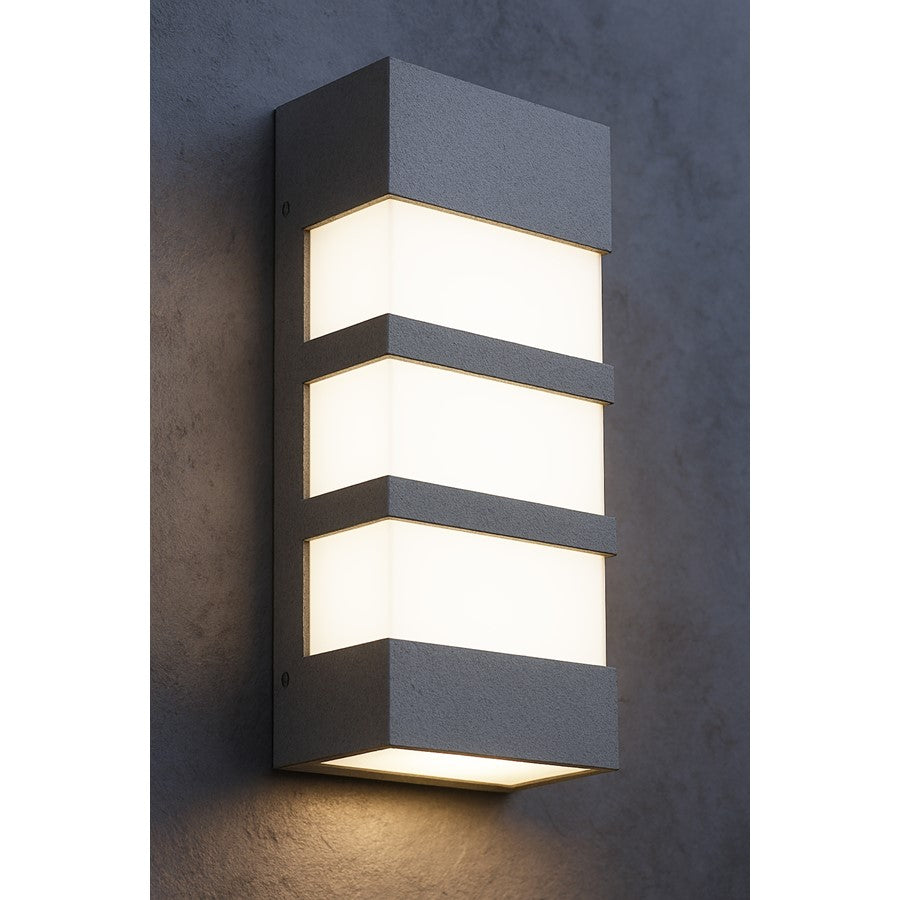 Modern Elegance Meets Durable Performance: The Contemporary LED Outdoor Sconce crafted from die-cast aluminum with a sleek powder coat finish, this outdoor sconce blends contemporary style with weather-resistant durability. Its decorative metal bands add architectural interest, while the white acrylic diffuser delivers soft, evenly distributed illumination. With an optional photo cell for effortless dusk-to-dawn operation, this fixture is perfect for elevating your porch, patio, or entryway with stylish, energy-efficient lighting.