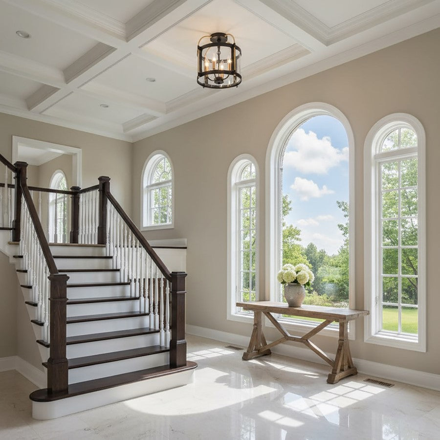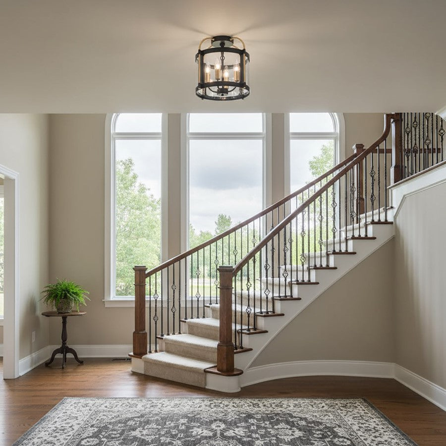 The Bonita Collection designed by Kevin Kraemer, features black frames with clear glassware and brass accents. The black metal frame provides a striking contrast to the warm brass accents, creating a visually stunning centerpiece for any space. Its intricate design, featuring a cage-like structure with glass panels, adds a touch of vintage charm while emitting a warm, inviting glow when lit. (4 lite Semi Flushmount shown)