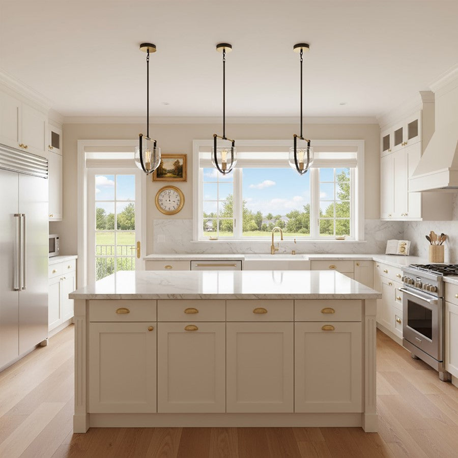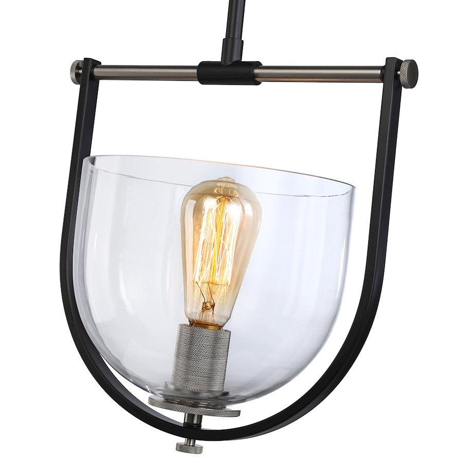 The Cheshire Collection is a spectacular grouping of chandeliers designed by Kevin Kraemer. The frames are black and complemented with brass or nickel. There is fine attention to all the details from the frame shape matching the curves in the glass to the exquisite knural parts on the candle covers and knobs. (Also available in black with nickel or brass accents). Single pendant shown.