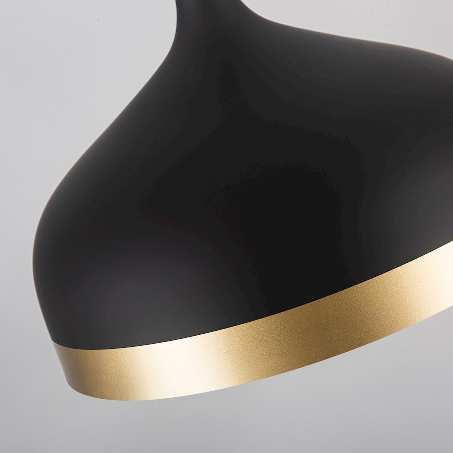 From the design house of Steven Sabados (S&C) is the Dash collection. Each model has textile height adjustable cables. The frame is finished in a matte black or glossy white with a stunning gold trim the continues on the inside of the metal shades. The 12” pendant is shown but also has a smaller 8” option, and a 4 light island model available. (Glossy white or Matte black with gold trim also available in all configurations)