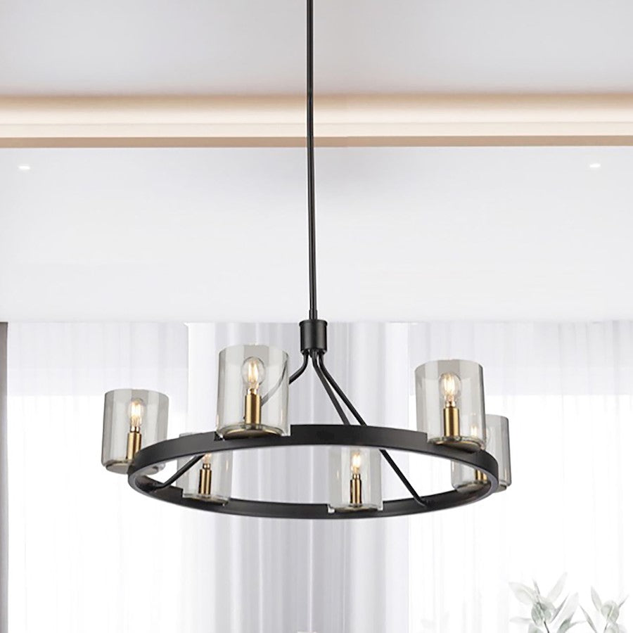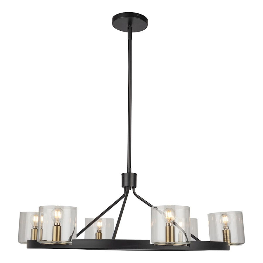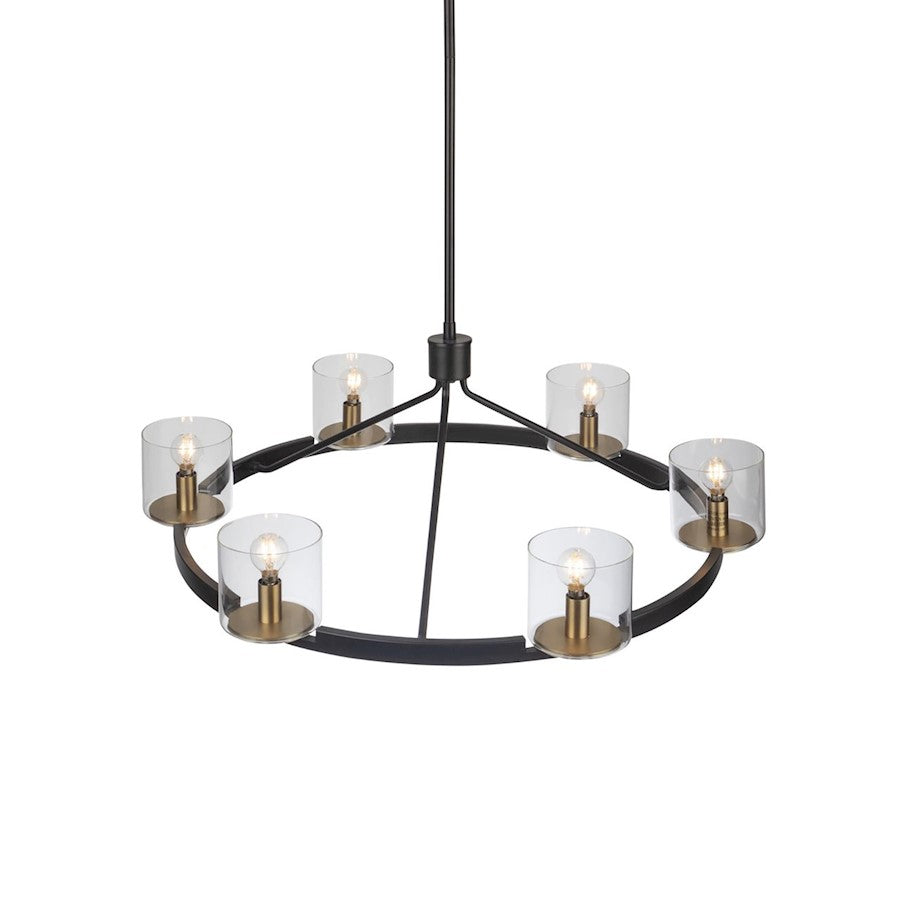 The Salinas Collection by designer Kevin Kraemer, has black frames complimented with brushed brass candles covered by clear cylinderical glassware. 6 light round chandelier model shown.