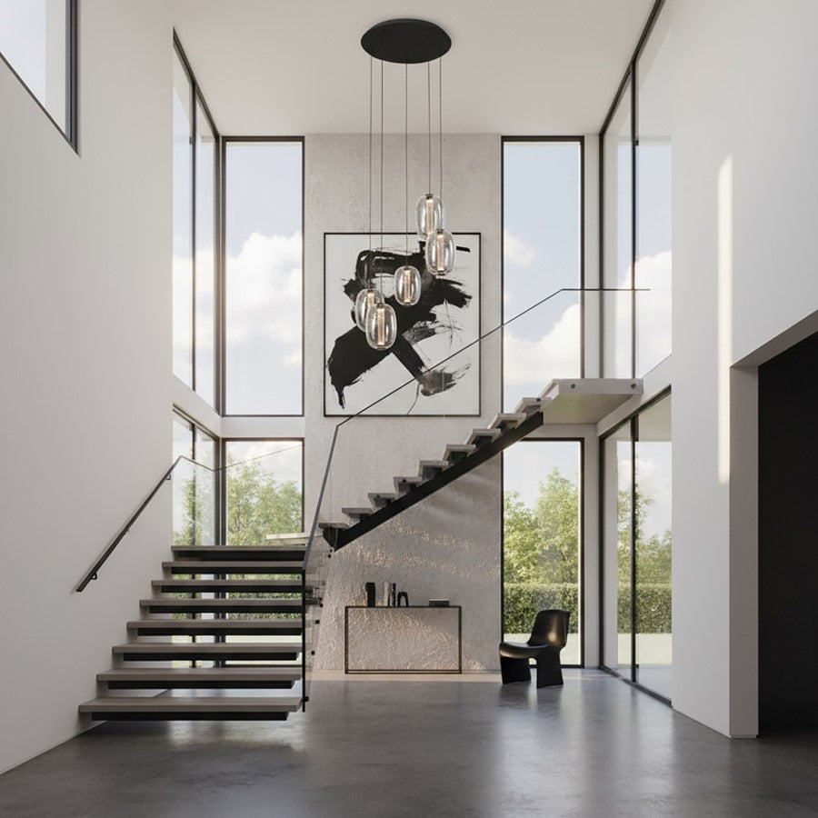 The LED foyer chandelier from the Vega Collection exudes an ethereal charm. The reflective dark smoke glass cradles a clear LED-illuminated cylinder, casting an alluring interplay of light and shadow. Complemented by rich black metalwork and an easy-to-use “push-pin” height adjustment, this pendant seamlessly blends elegance with practicality. A great addition to any surrounding.