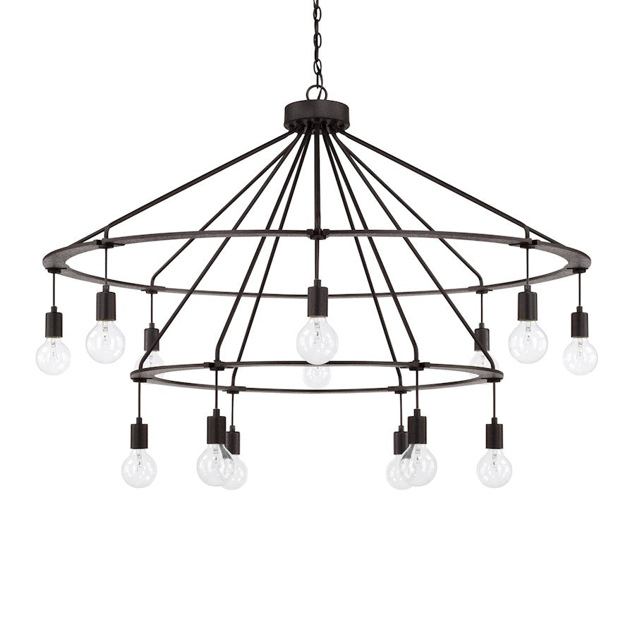 Brimming with rustic character, this 14-light chandelier brings farmhouse charm to a dining room or living room. A wide conical silhouette includes a pair of concentric bands with the appearance of lamps being strung through them. Borrowing a hint of the past with a cast-iron like textured black finish and exposed, dangling lamps, this dining room chandelier is sure to be a style centerpiece.