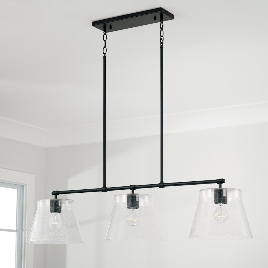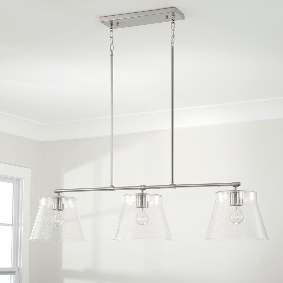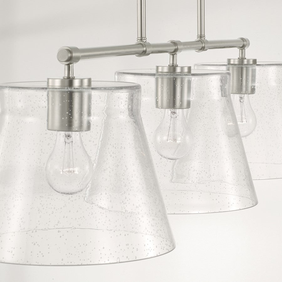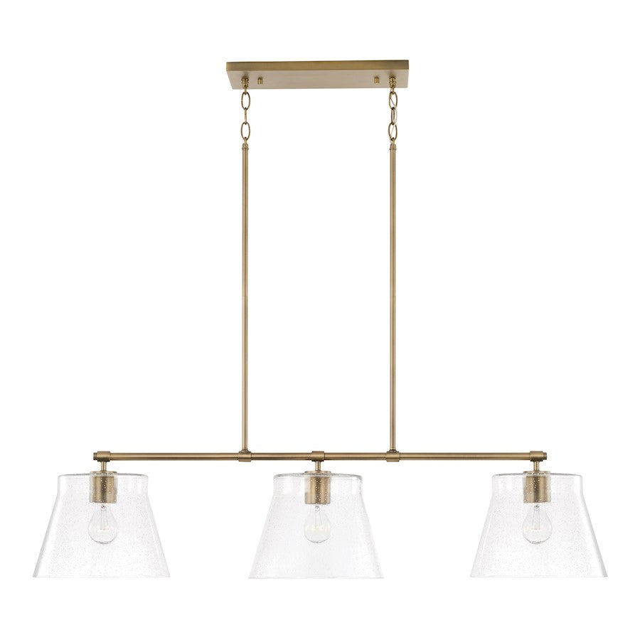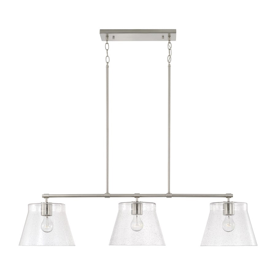 Simple and sleek, the Baker Island for Homeplace brings standout style to signature pieces. The Aged Brass or Brushed Nickel or Matte Black finish beautifully accents the tapered seeded glass for versatility and sophistication.