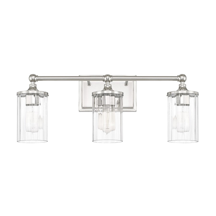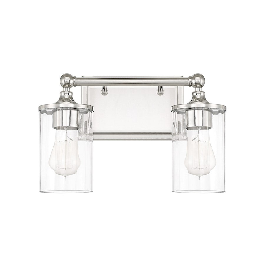 Perfect for breathing life into a powder room or a small bath, the Camden vanity offers refreshing, modern style. A Polished Nickel frame featuring rounded accents and a beveled backplate supports a pair of ribbed glass shades.