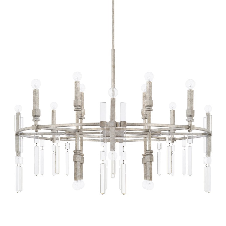 The Drake 20-light chandelier elevates mid-century modern style on a grand scale. This fixture features geometric, sculptural design paired with crystal adornments, reminiscent of jewelry with a hint of sparkle. Sleek K9 crystals, some nestled in the frame and some dangling below, complement the Antique Silver finish, as this chandelier transforms a contemporary living room or dining room.