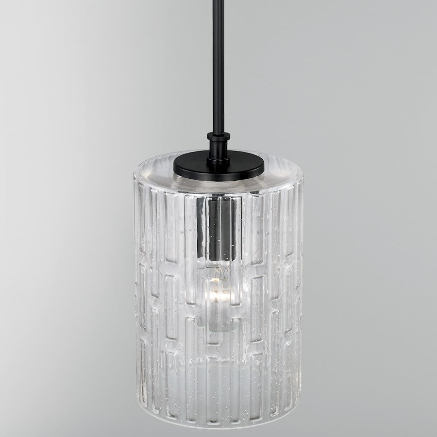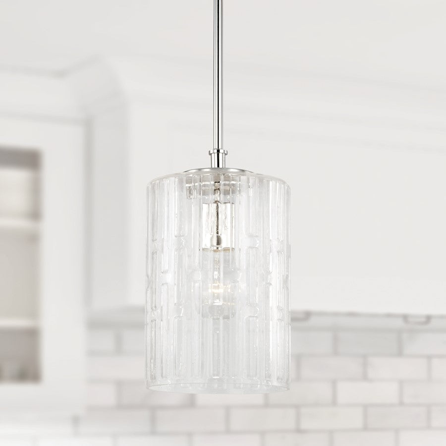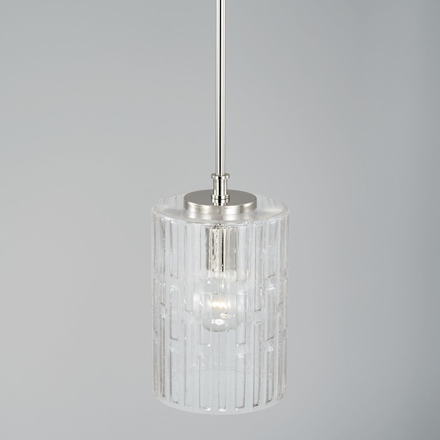 Create a simple and striking statement with the Emerson 1-Light Pendant. This fixture features elongated seeded glass with an embossed geometric pattern sparkles on a clean and classic Aged Brass frame.