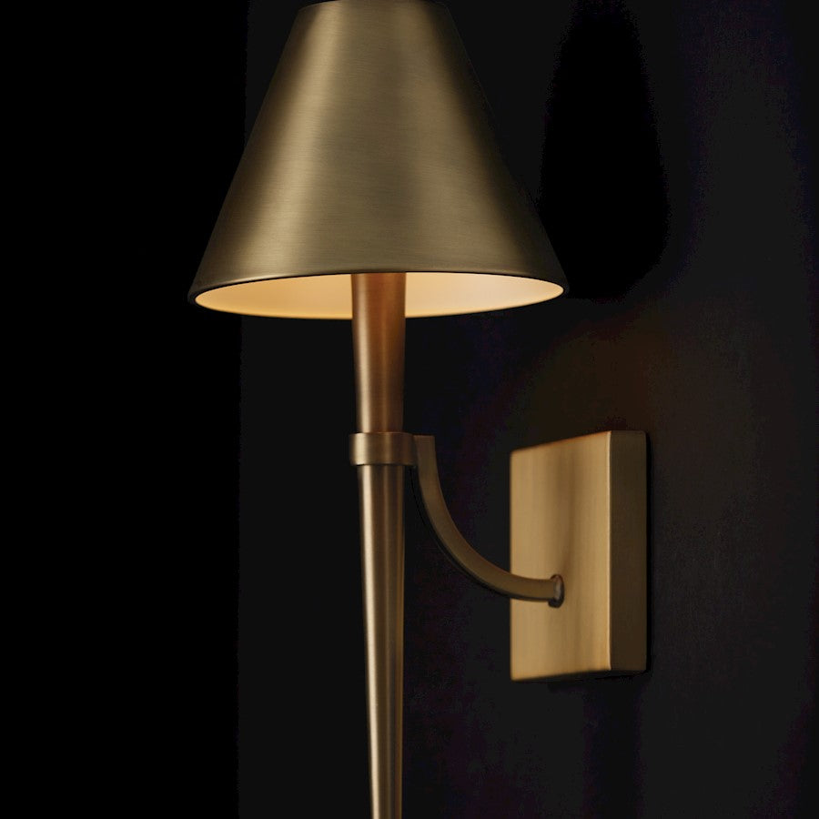 With a classic elegance that commands attention, the Holden Sconce adds sleek sophistication to any space. The dapper Details and tapered metal shade in Aged Brass or Matte Black or Polished Nickel finish bring designer style and add dimension.