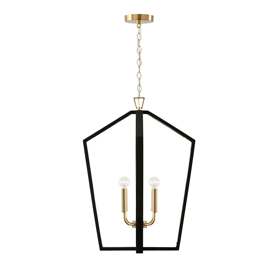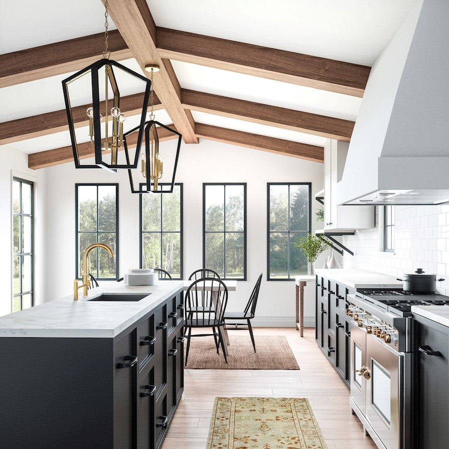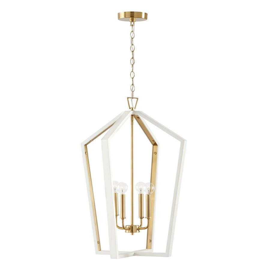 A sleek silhouette and intriguing Details define the Maren Pendant. The bands of Matte Brass metal line the interior of the flat black or flat white or dark stained painted mango wood, creating an unexpected detail on the intersecting arms and casting a warm glow on the open-air frame.