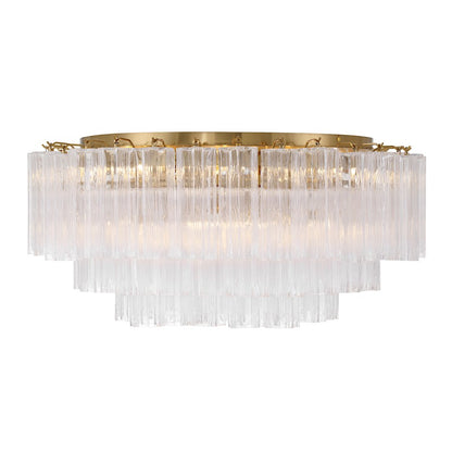 The captivating Addis Lighting Collection is a modern-day interpretation of the iconic mid-century Tronchi chandelier. Inspired by its predecessor's sleek lines and geometric shapes, the Addis features a polished Chrome or Aged Brass metal frame that exudes sophistication and style. Its unique design showcases transparent tiers of textured Tronchi glass tubes, forming a mesmerizing 5-point rounded star shape. Choose from a range of glass colors, including clear, amber, smoke, and white, or the stunning Autumn option, which features a captivating multicolor disposition of amber, clear, and smoke Tronchi glass. The Addis Lighting Collection offers various sizes and finishes, allowing you to find the perfect fit for your space while adding a touch of timeless elegance.