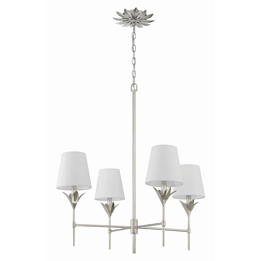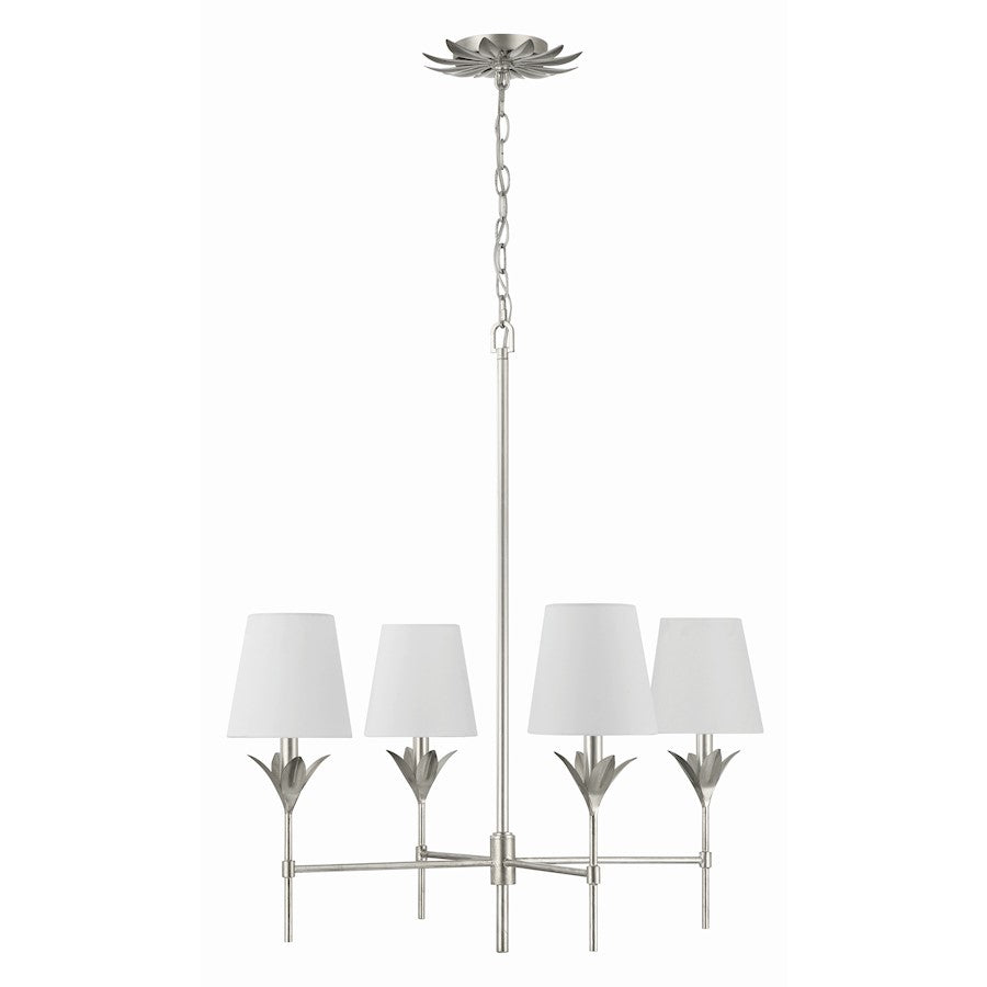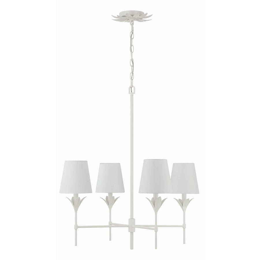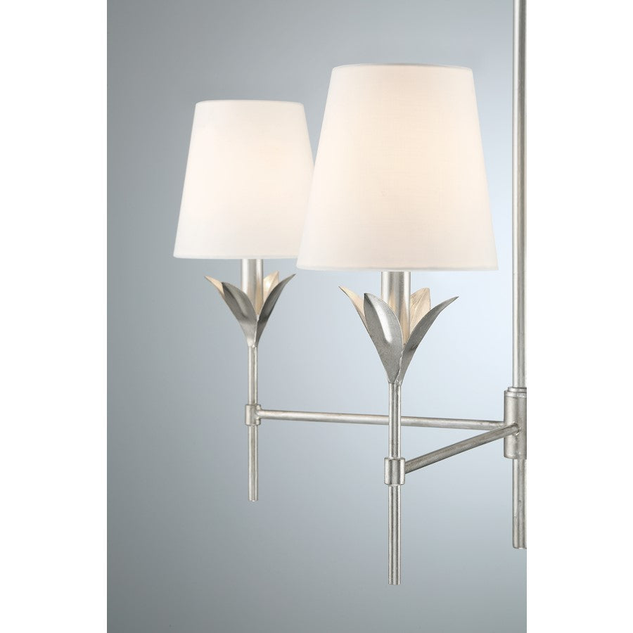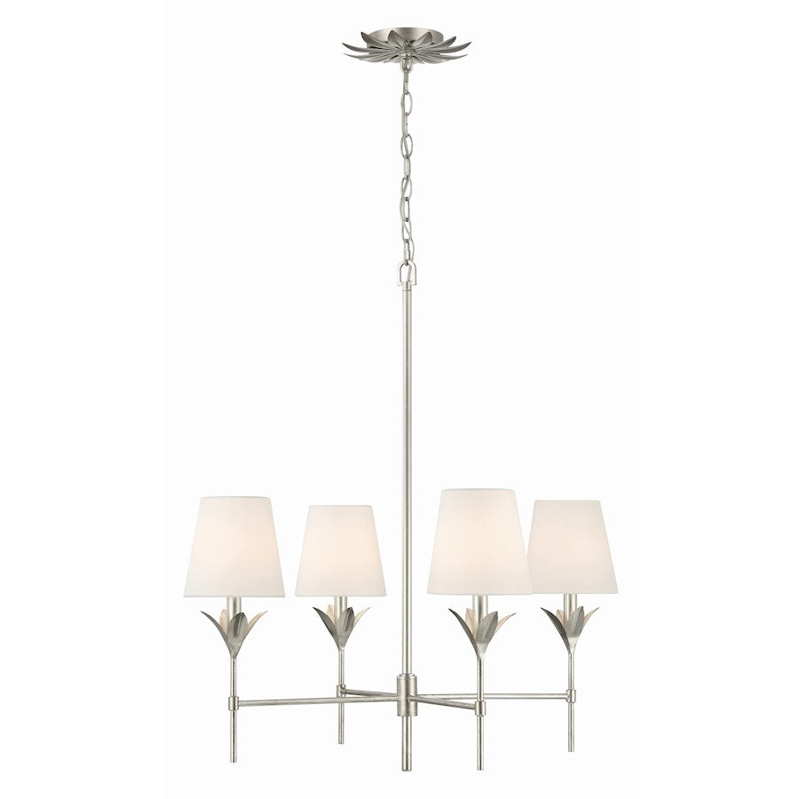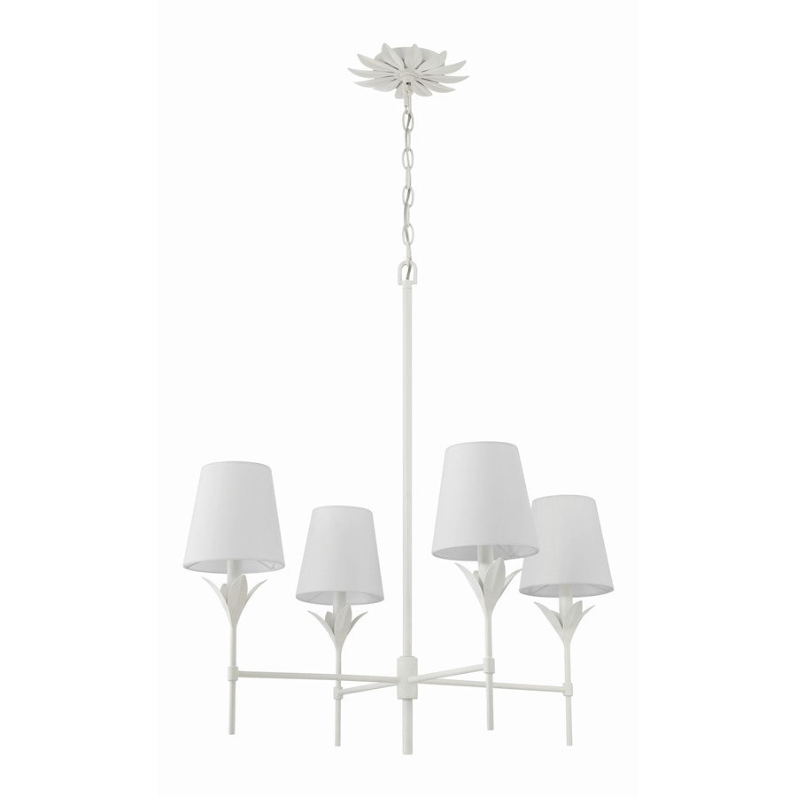 The Broche 4 Light Chandelier embodies a harmonious blend of traditional and modern elements. This fixture exudes timeless elegance with its candelabra-style frame and white linen shades. The layered wrought iron leaves create a stunning and functional display of light. Whether in a bedroom, living area, or kitchen, this chandelier adds a touch of refined glamour to any space, making it perfect for transitional and modern designs.