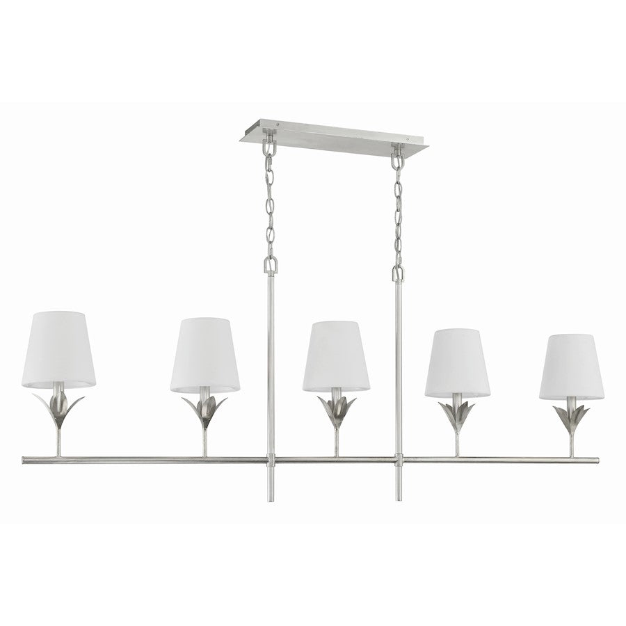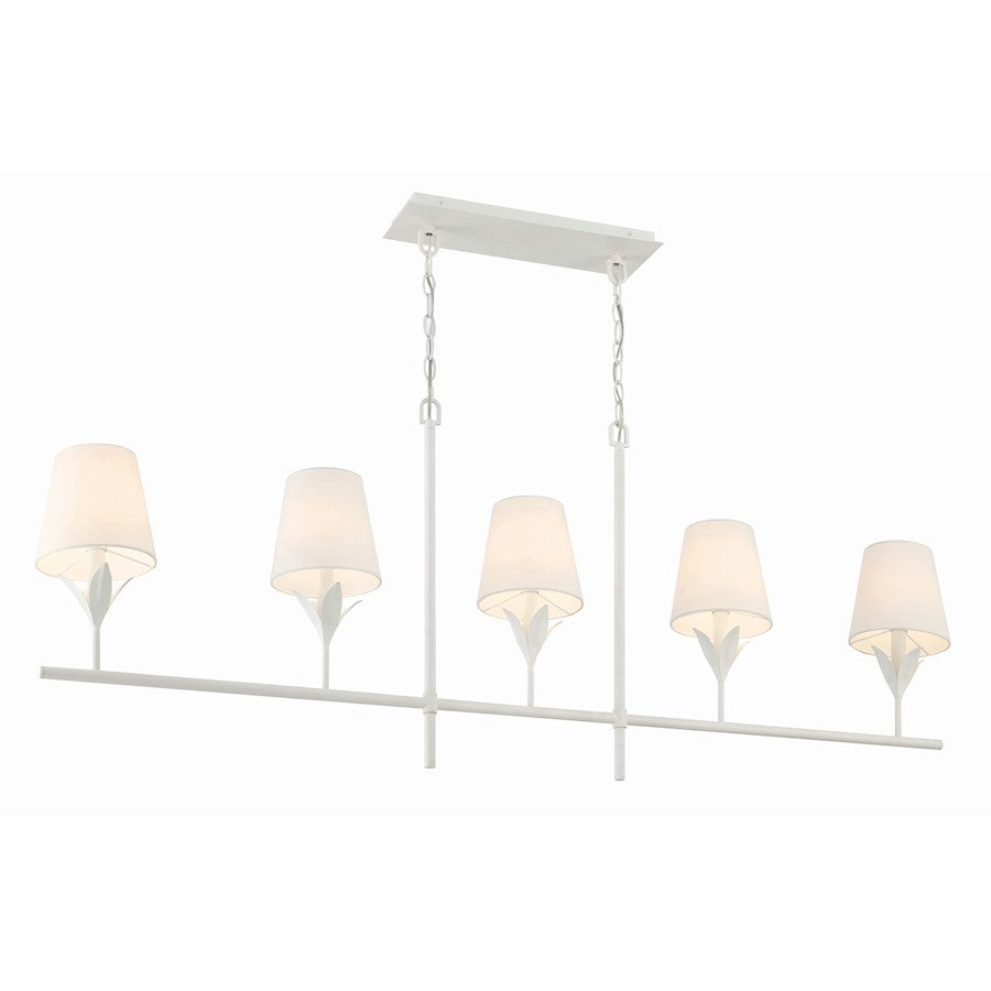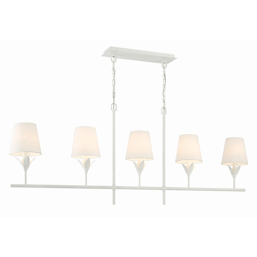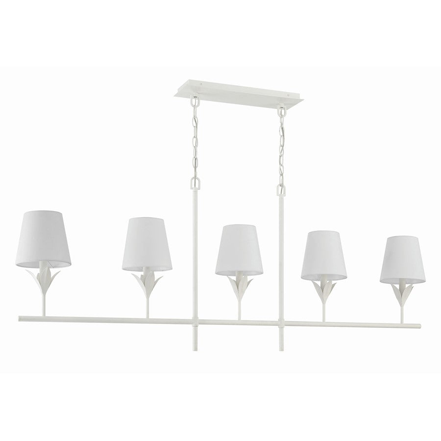 The Broche 5 Light linear Chandelier embodies a harmonious blend of traditional and modern elements. This fixture exudes timeless elegance with its candelabra-style frame and white linen shades. The layered wrought iron leaves create a stunning and functional display of light. Whether in a dining room, or over a kitchen island, this chandelier adds a touch of refined glamour to any space, making it perfect for transitional and modern designs.