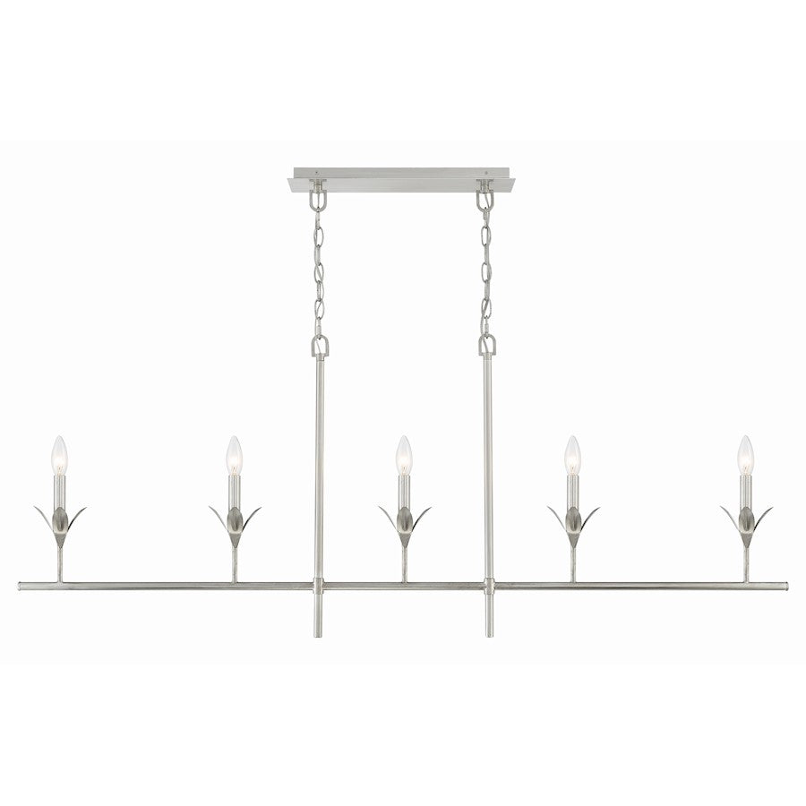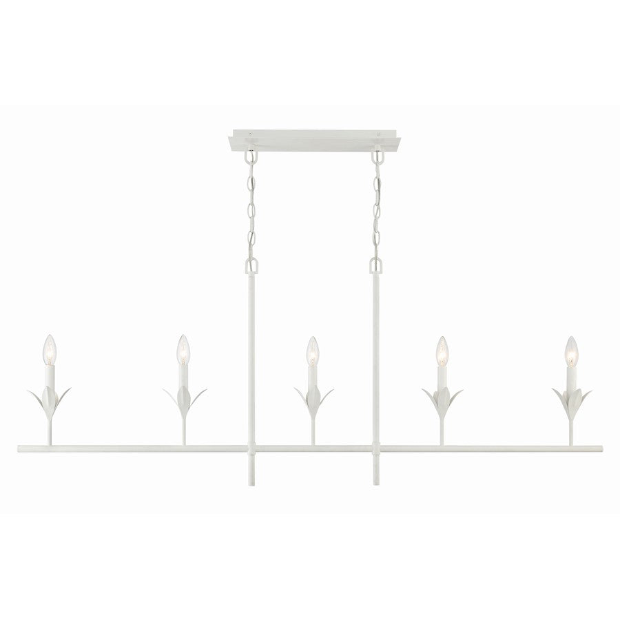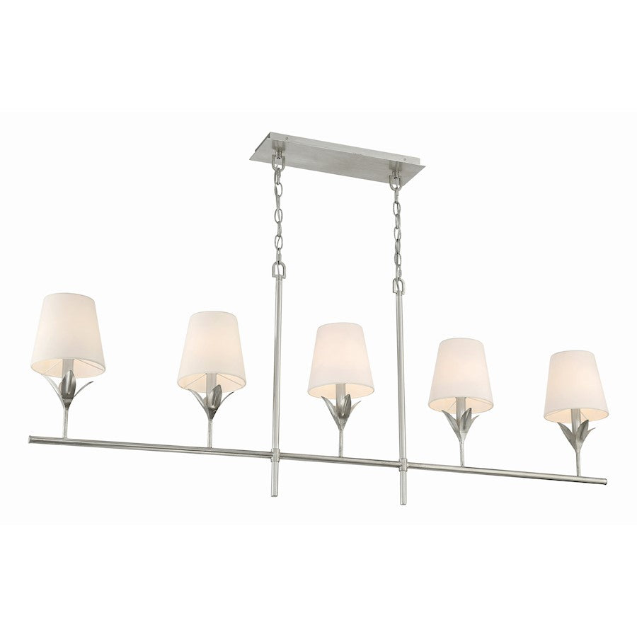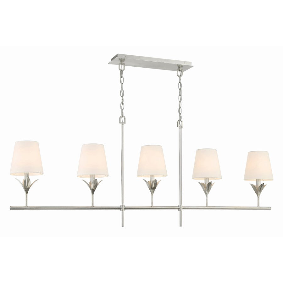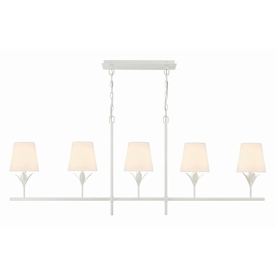 The Broche 5 Light linear Chandelier embodies a harmonious blend of traditional and modern elements. This fixture exudes timeless elegance with its candelabra-style frame and white linen shades. The layered wrought iron leaves create a stunning and functional display of light. Whether in a dining room, or over a kitchen island, this chandelier adds a touch of refined glamour to any space, making it perfect for transitional and modern designs.