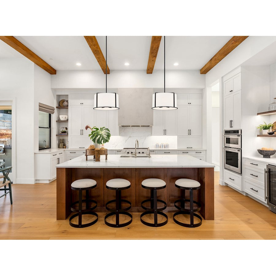 Showcasing a silhouette of a classic drum pendant, the Carlyn contrast of hard metal with smooth silk makes for an elegant contrast. Mixing materials with contrasting finishes deliver striking simplicity and adds a beautiful dimension to the Carlyn collection. Available in large, medium, and small pendant sizes, this collection is perfect for adding a welcoming tone to a room.