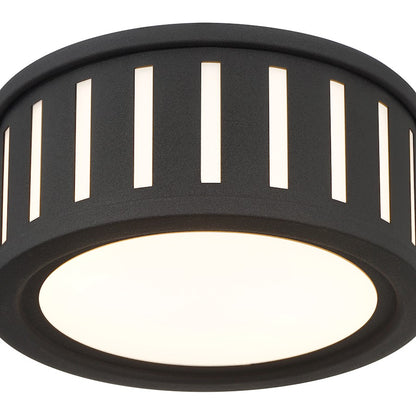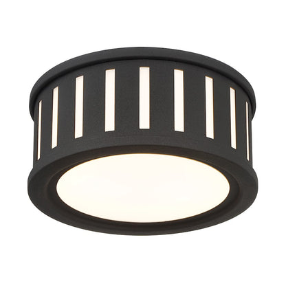 The contemporary Kendal collection makes a statement with its graphic uniform pattern. Its metal frame surrounds white glass in this elegant drum-shaped ceiling mount. The high contrast of Vibrant Gold, Black Forged, or Polished Nickel against white glass is a great way to add a touch of drama to a room.