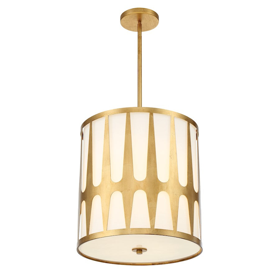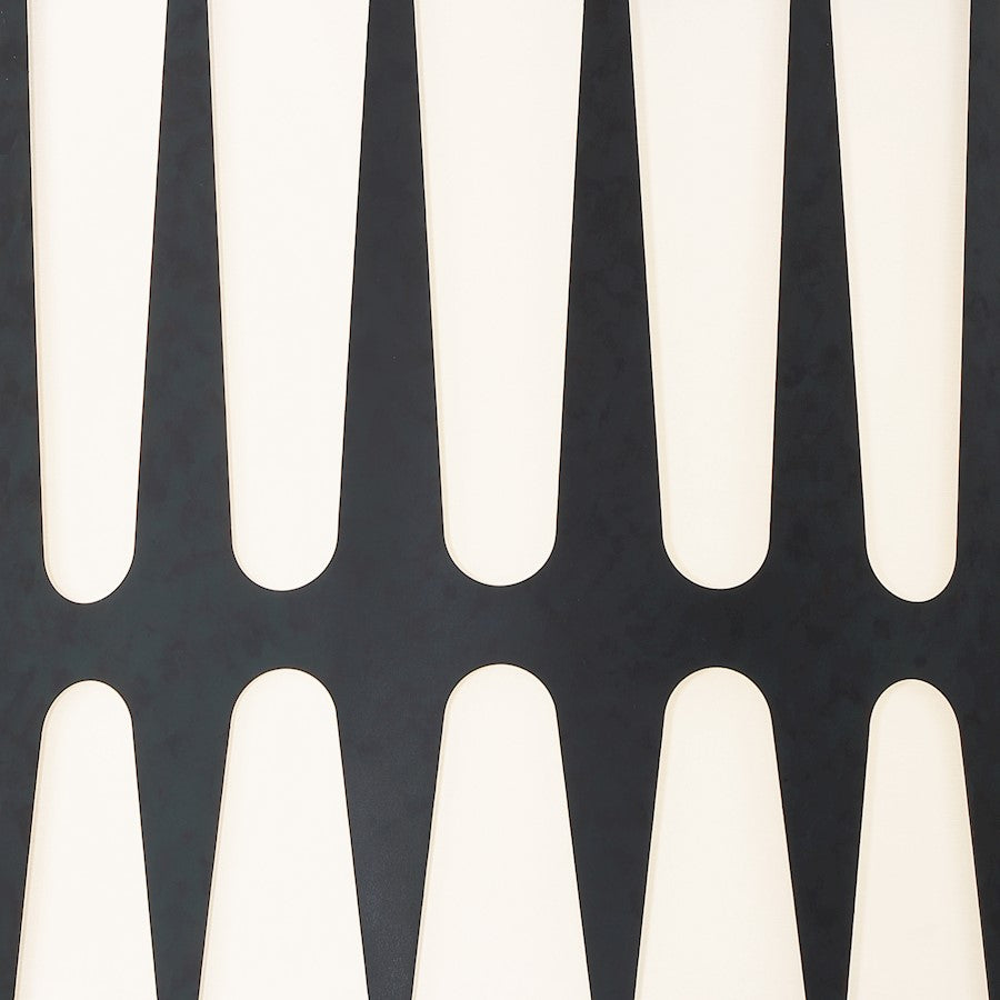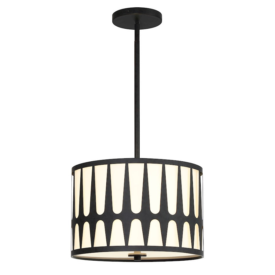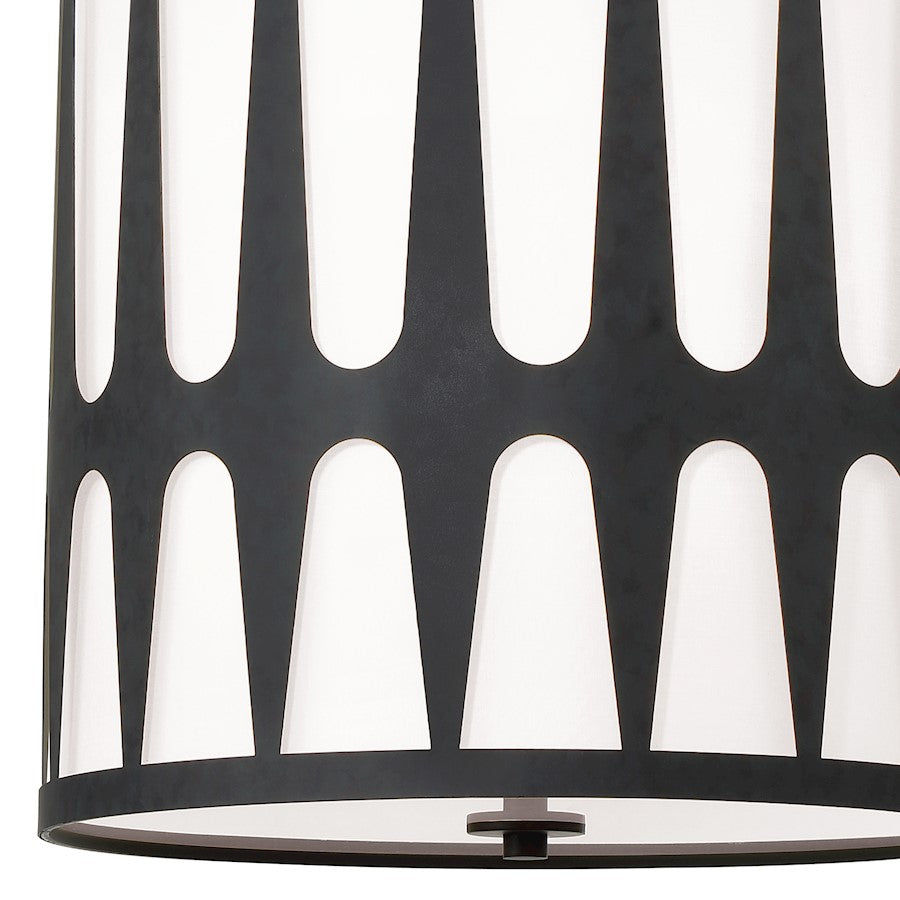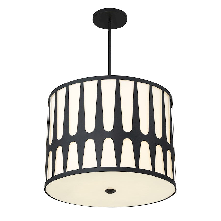 - Makes a statement with its graphic metal frame surrounding a white fabric drum shape.
