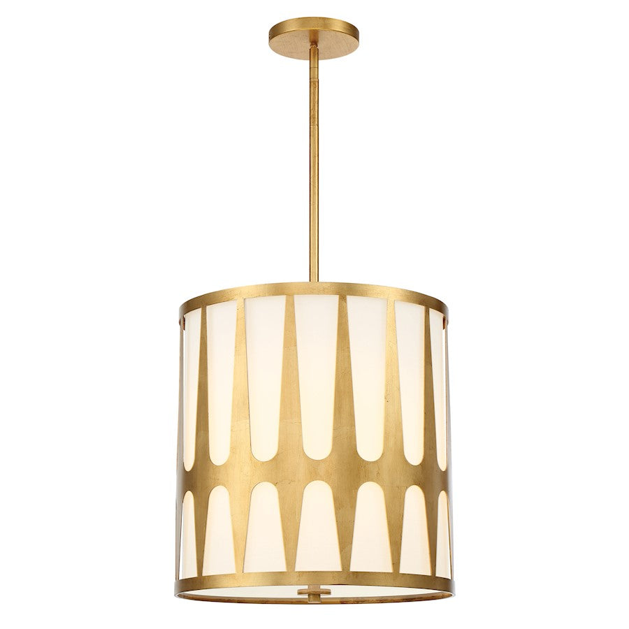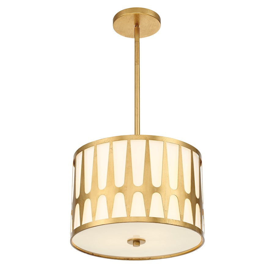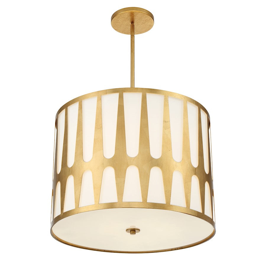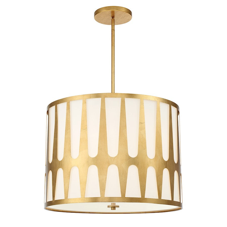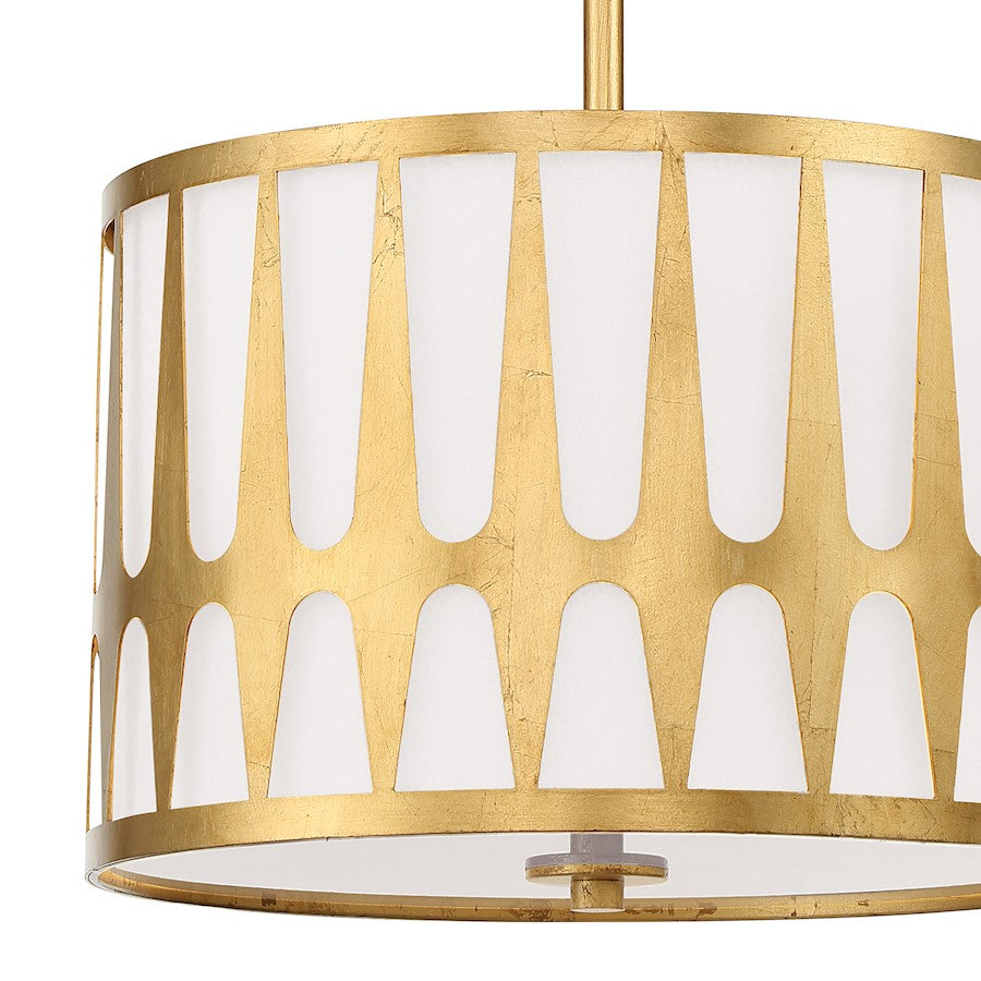 - Makes a statement with its graphic metal frame surrounding a white fabric drum shape.