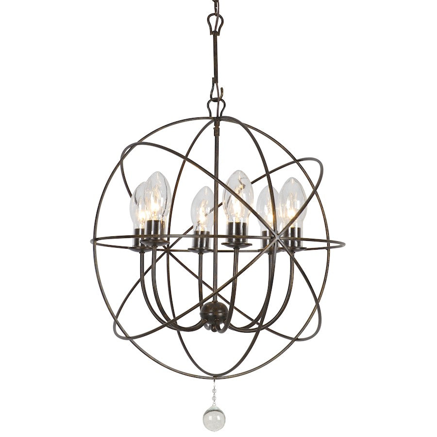 Renew your outdoor living space with this stunning Mini Solaris Chandelier now rated for outdoor applications. This fashionable design features a series of flowing sphere shapes surrounding a cluster of candlestick bulbs covered by clear glass shades all suspended by a distinctive chain-and-hook detail. The creative mix combines a contemporary wrought iron form with a traditional, English bronze finish. The clean-lined Solaris model looks good in any setting, from traditional to contemporary and can be used both indoors and outdoors.
