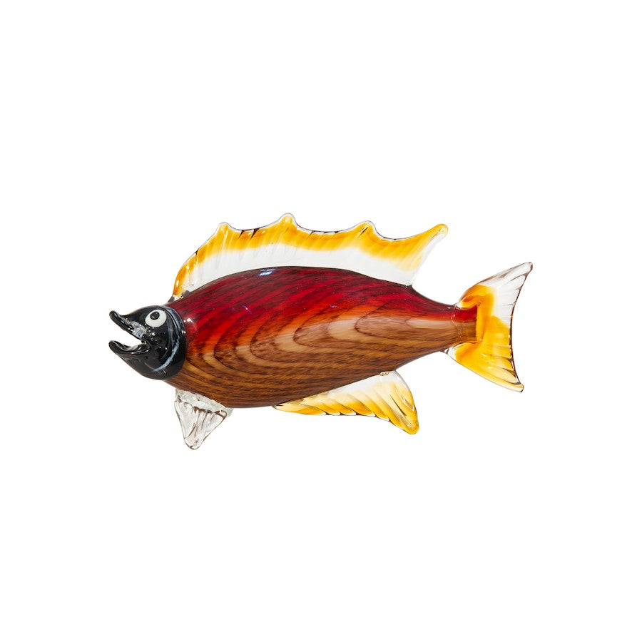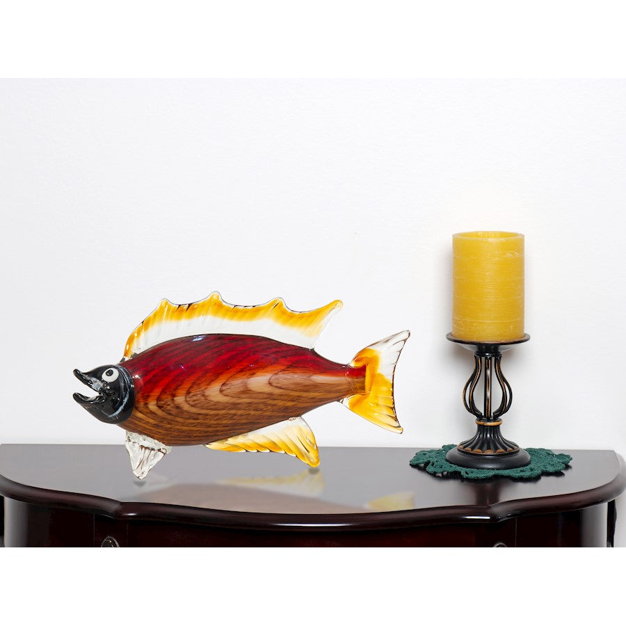 This delightful Kuril Fish Handcrafted Art Glass Sculpture is a delightful addition to any decor style. The generously sized figure depicts a large fish in waves of red and warm amber throughout his body. His wide open mouth, bright eyes, and beautifully textured fins are clear glass with rich gold highlights that adds to the very realistic feel of the piece. The sculpture is hand blown using Favrile art glass. Because of this, please allow for slight variations in color and texture. A bright centerpiece on a dining or coffee table, our Kuril Fish Handcrafted Art Glass Sculpture also makes the perfect gift for anglers and marine enthusiasts.