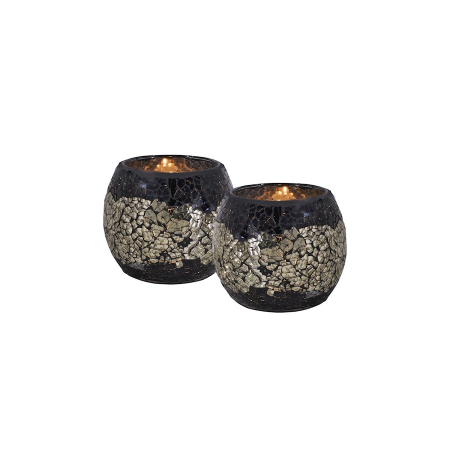 This 2 piece Quartz Candle Holder set will add a rich, warm glow to any decor style. Matching votive holders each feature dual bands of dark black art glass, set in a mosaic pattern, on the top and bottom. The black is accented with a touch of shiny gold for added texture. A band of glimmering silver runs around the center of each. These lovely candleholders will cast a multitude of sparkles about the room when you place a lighted candle inside. Our Quartz Candle Holder Set is an ideal gift for yourself or anyone who appreciates the finer things that life has to offer.