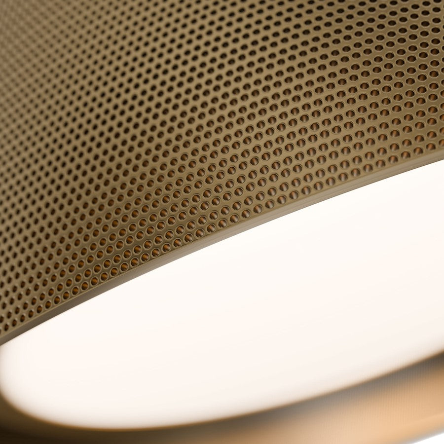 A perforated metal shade offers additional visual interest from tiny pinpoints of illumination. Its frosted glass diffuser casts a lovely downward glow.