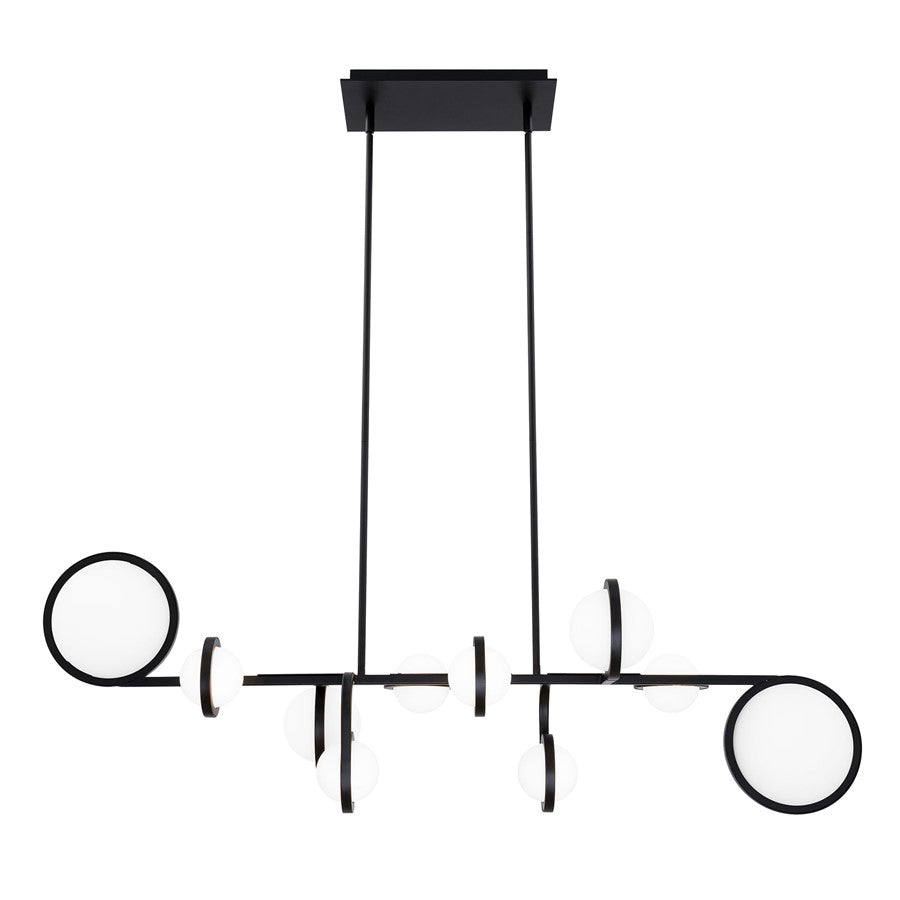 Satalite delivers an otherworldly glow from etched opal globes orbiting a central axis. Wrapped in bands of metal and dramatic in scale, the pendant makes a celestial statement in your space.