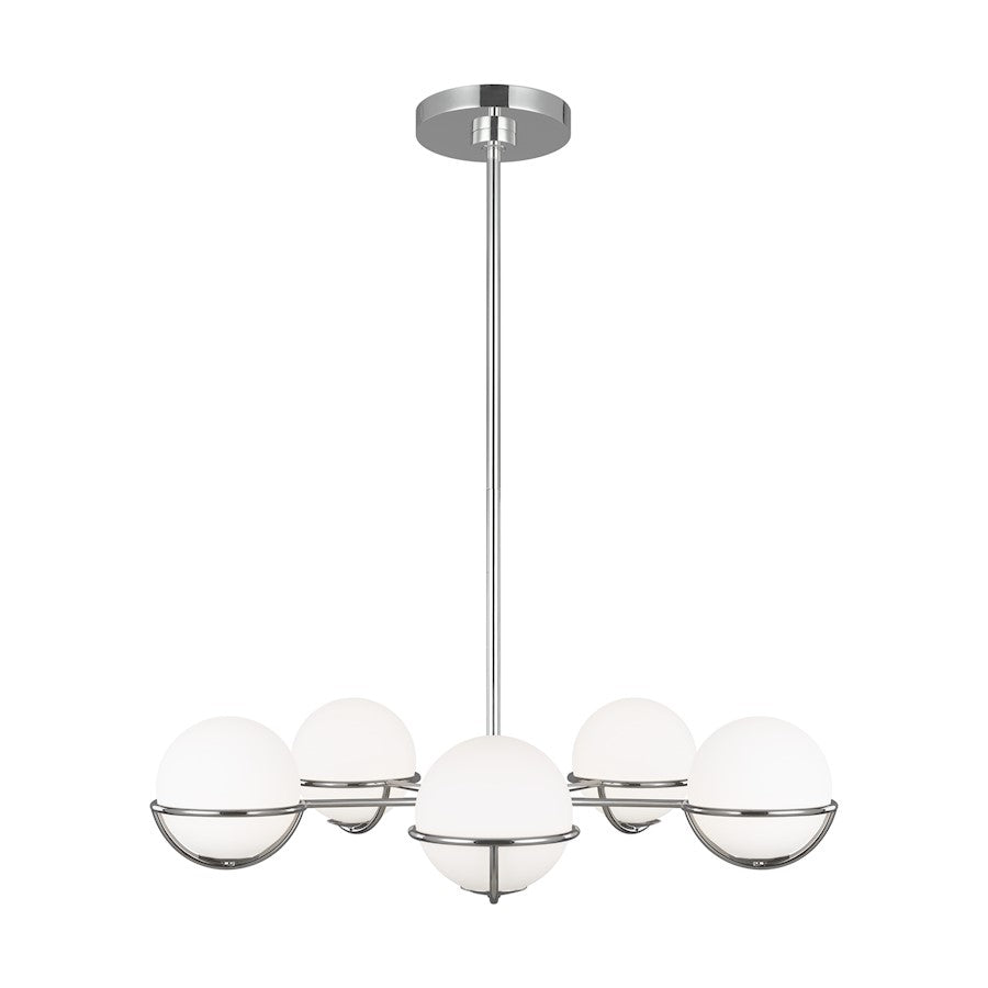 The modernist Apollo impresses with perfectly balanced White Opal Etched Glass globes that gently rest within a spherical Burnished Brass or Polished Nickel frame. Apollo's cosmic appeal and artistic mid-century design is sure to become the focal point of any space.