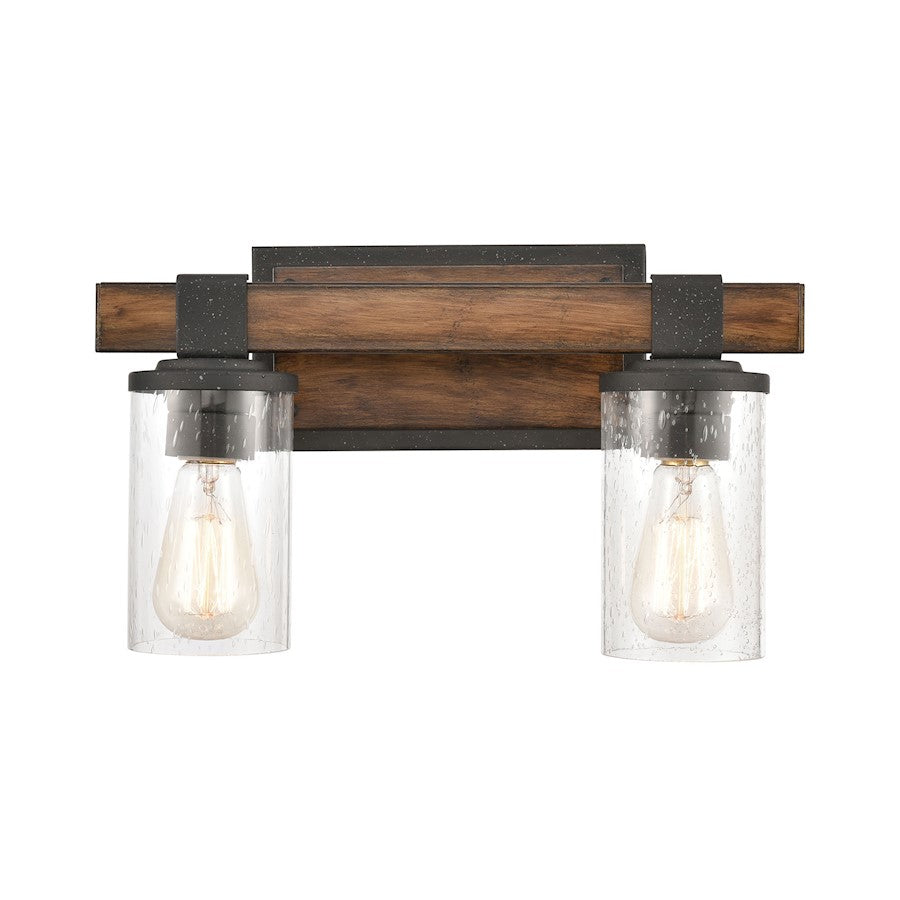 The Crenshaw vanity light features rustic combination of metalwork and seedy glass cylinders, which are suspended from rugged looking brackets. The Ballard Wood or Distressed Antique Graywood finish is contrasted with distressed black- or Anvil Iron finished accents.