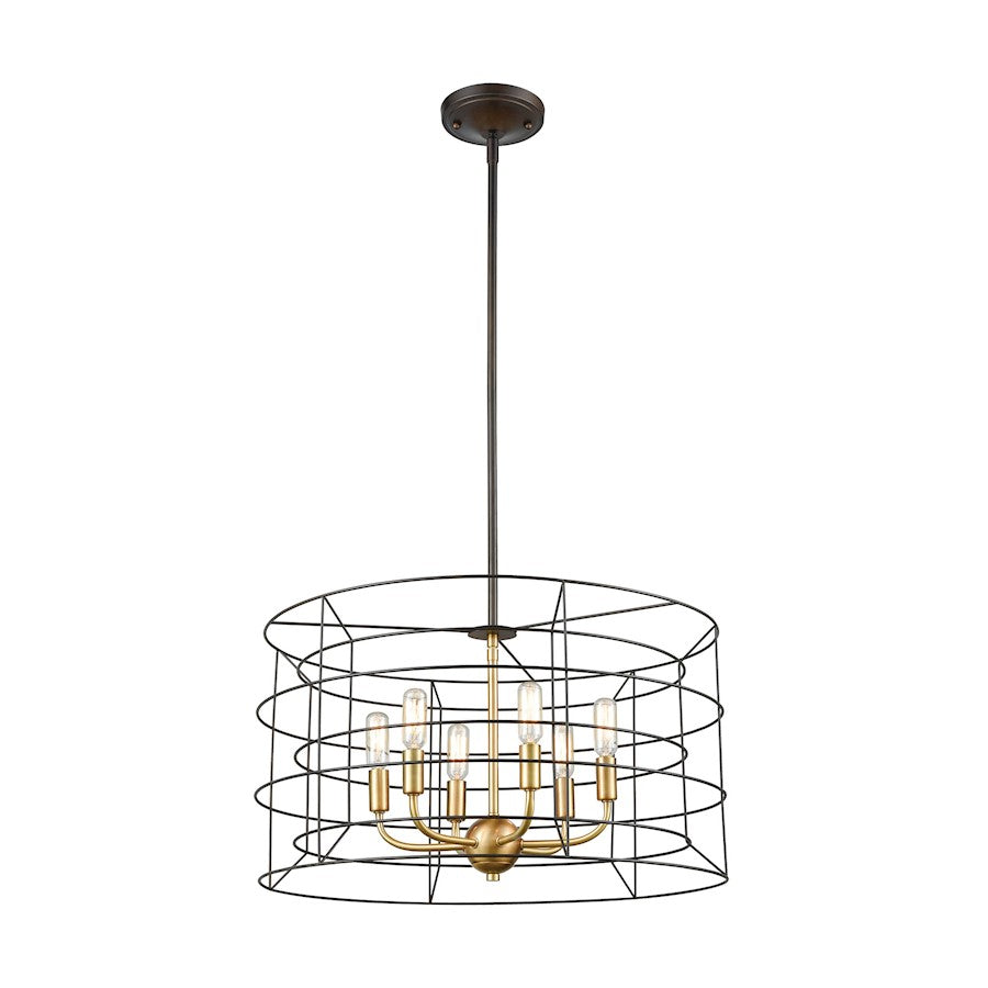 The Dayton drum pendant features an oversized double drum wireframe. Satin Brass finished socket hardware accents the Oil Rubbed Bronze finished frame.