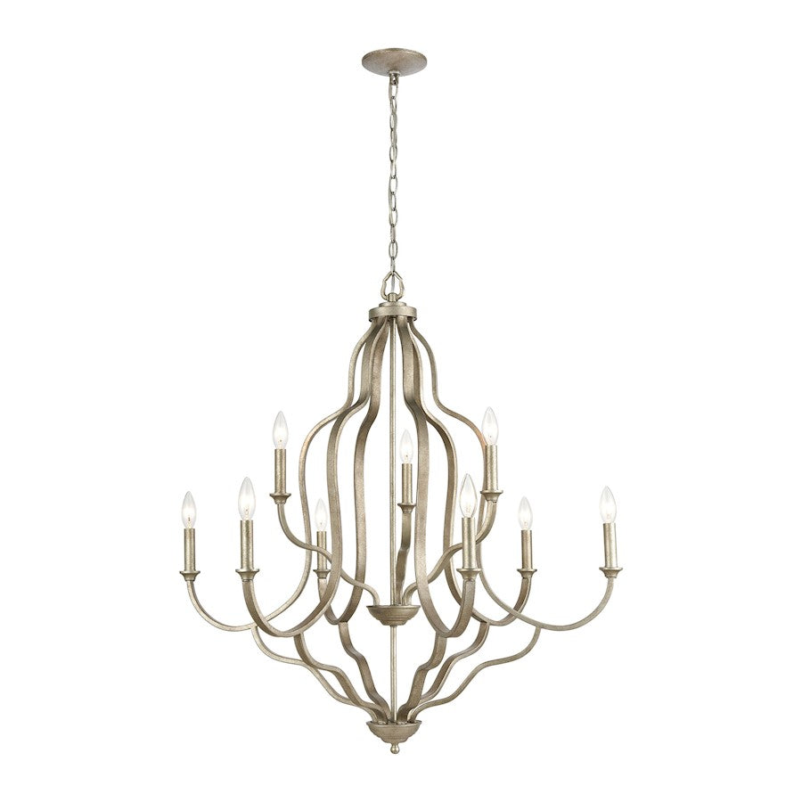 The Lanesboro chandelier has an updated traditional design with flowing metalwork and grand proportions. Finished in Dusted Silver.