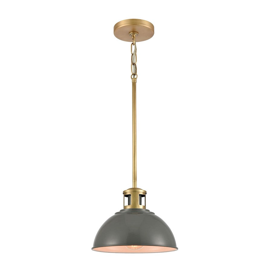 The Lyndon pendant has a gray or white dome shade for functional downlight and a decorative cap. The shade is finished in gray with brass accents.
