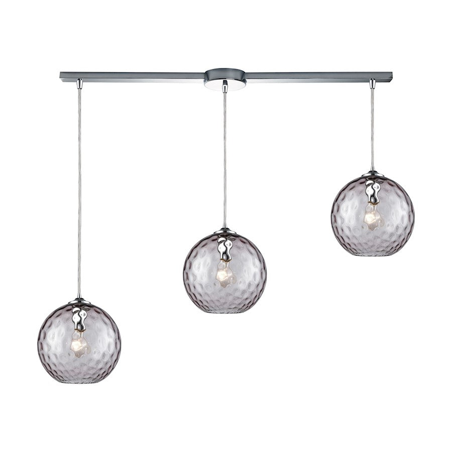 Blown water glass spheres are embellished with a spun center column. Finished in polished chrome with hammered glass in a variety of subtle color choices.