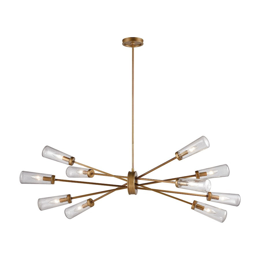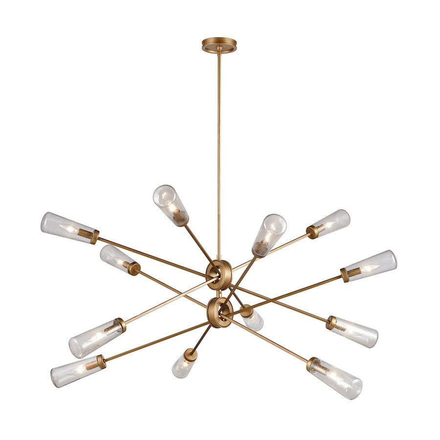 This chandelier light showcases a unique linear design with unequal length arms that pass through the fixture's central connection. The metal arms can be easily adjusted from a near parallel position to a loosely gathered look. Finished in Matte Gold with clear seedy glass.