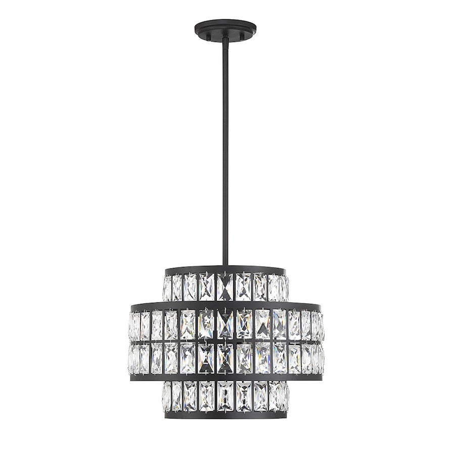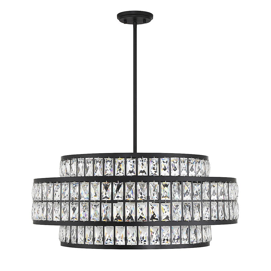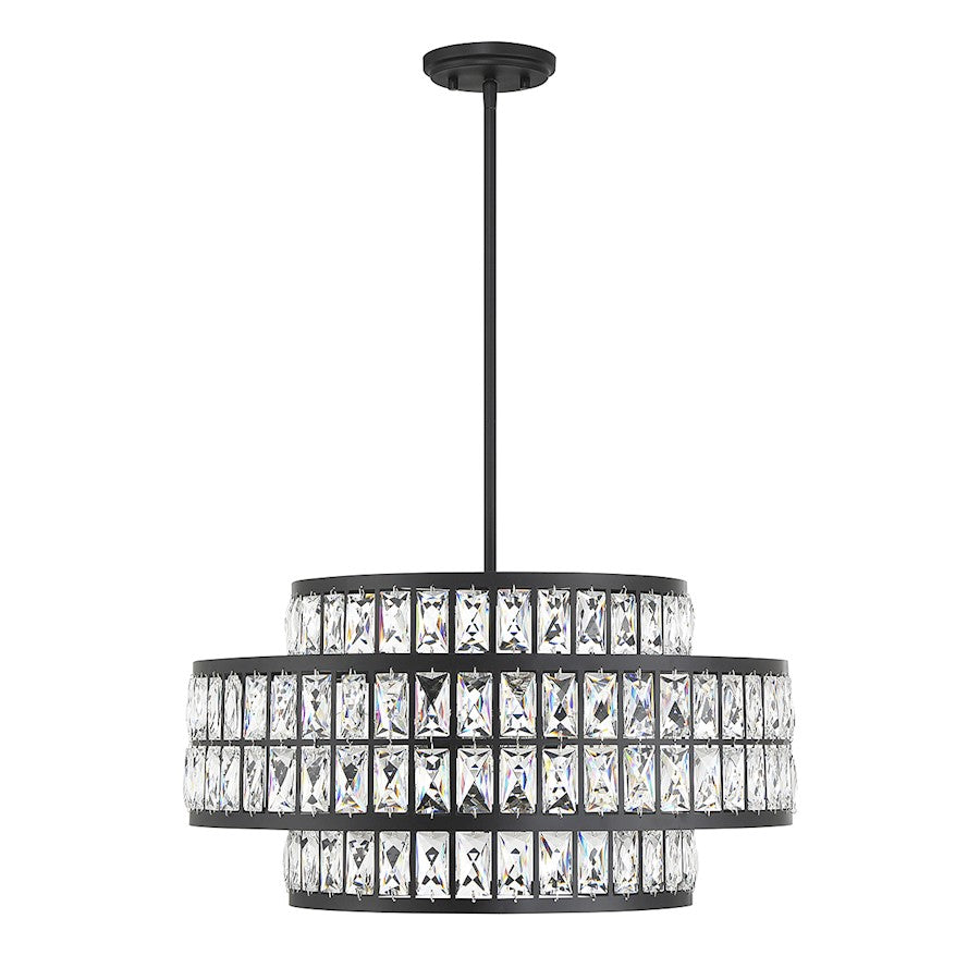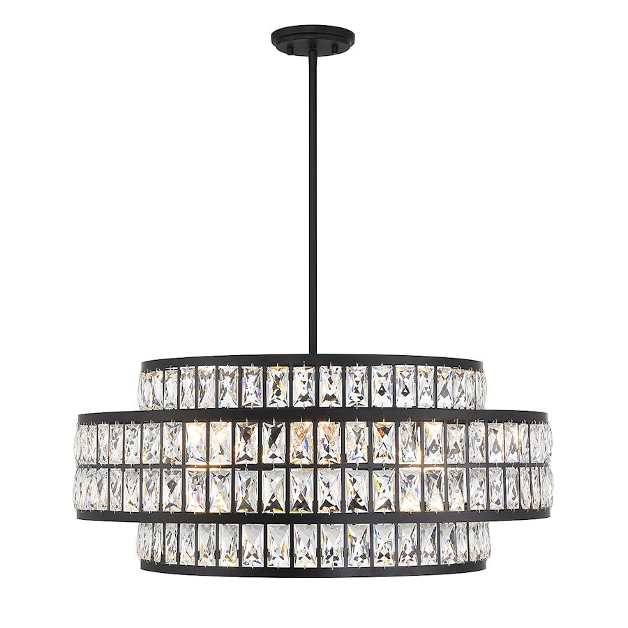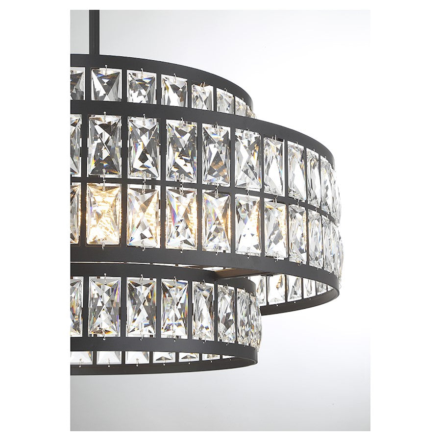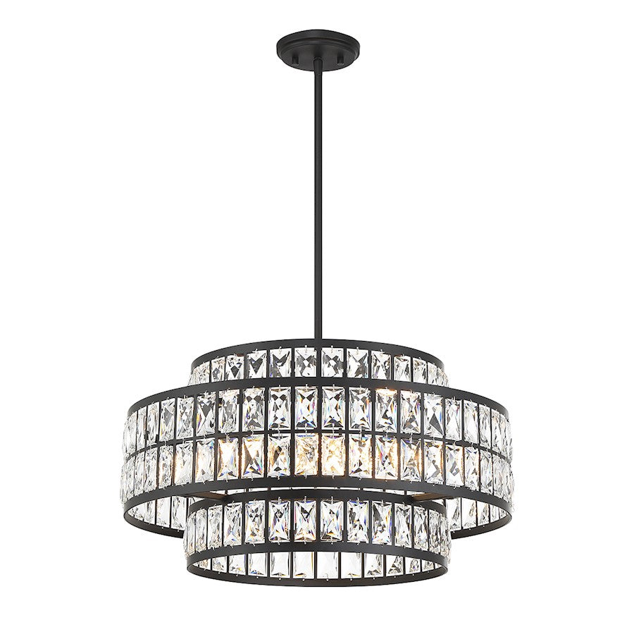 It is often said that lighting is the jewelry of the home and the Savoy House Renzo 3-light or 4-light or 6-light pendant is a perfect example of this saying. Faceted clear crystal decorates the two layers of shades, which overlap in an intriguing way and are finished in matte black or warm brass. Renzo is 16" or 22" or 28" in width and has an adjustable height ranging from 12" to 66". Comes with four 12" downrods and one 6" downrod. It uses 3 standard size bulbs of up to 60 watts per bulb (bulbs not included).