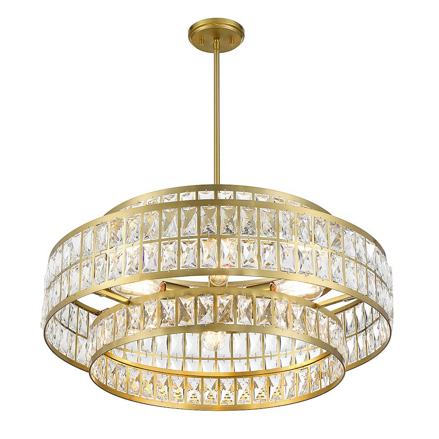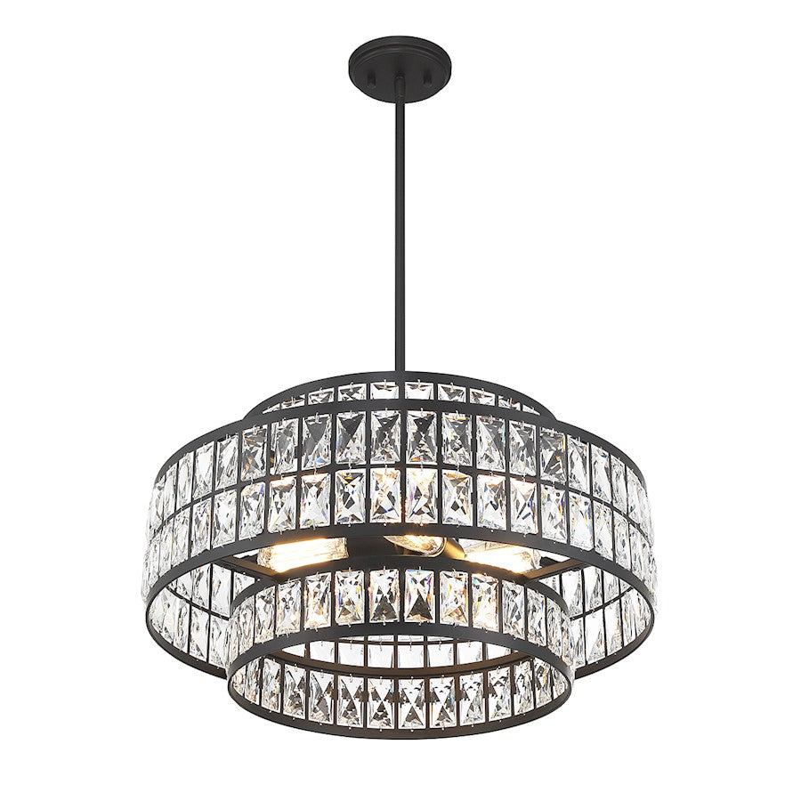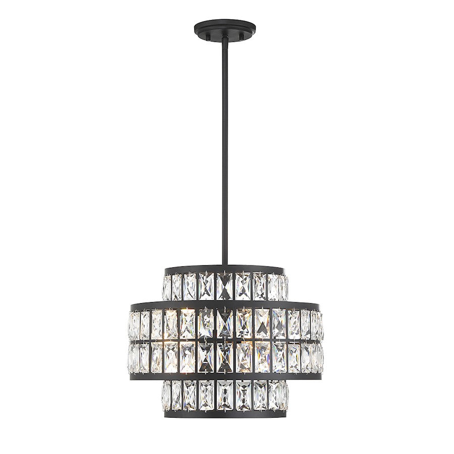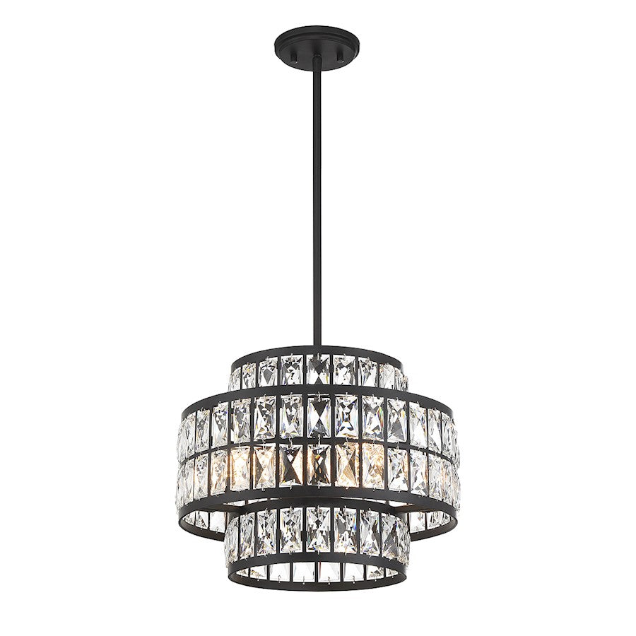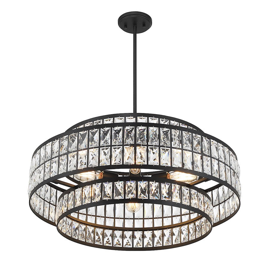 It is often said that lighting is the jewelry of the home and the Savoy House Renzo 3-light or 4-light or 6-light pendant is a perfect example of this saying. Faceted clear crystal decorates the two layers of shades, which overlap in an intriguing way and are finished in matte black or warm brass. Renzo is 16" or 22" or 28" in width and has an adjustable height ranging from 12" to 66". Comes with four 12" downrods and one 6" downrod. It uses 3 standard size bulbs of up to 60 watts per bulb (bulbs not included).