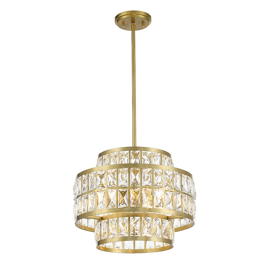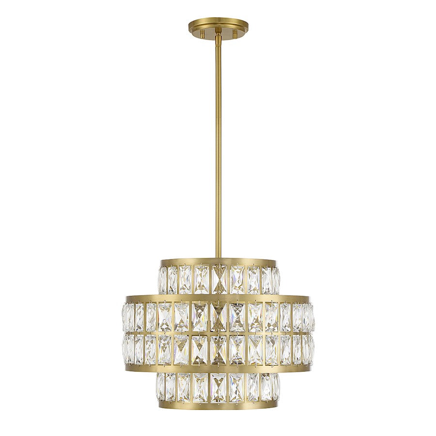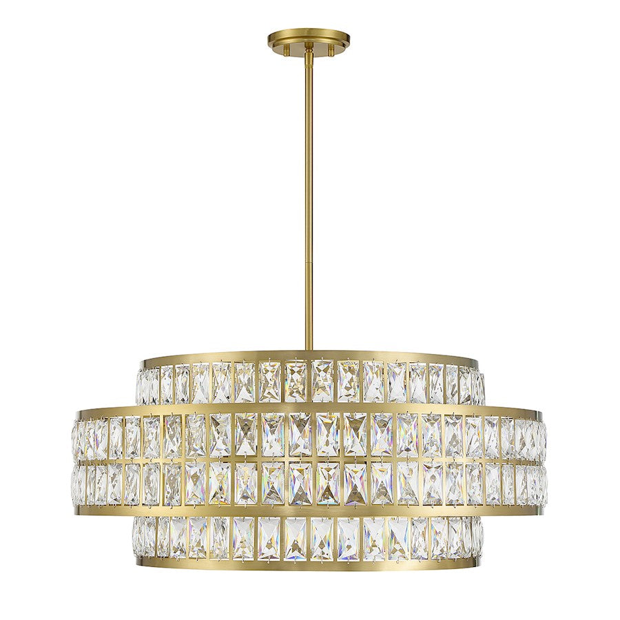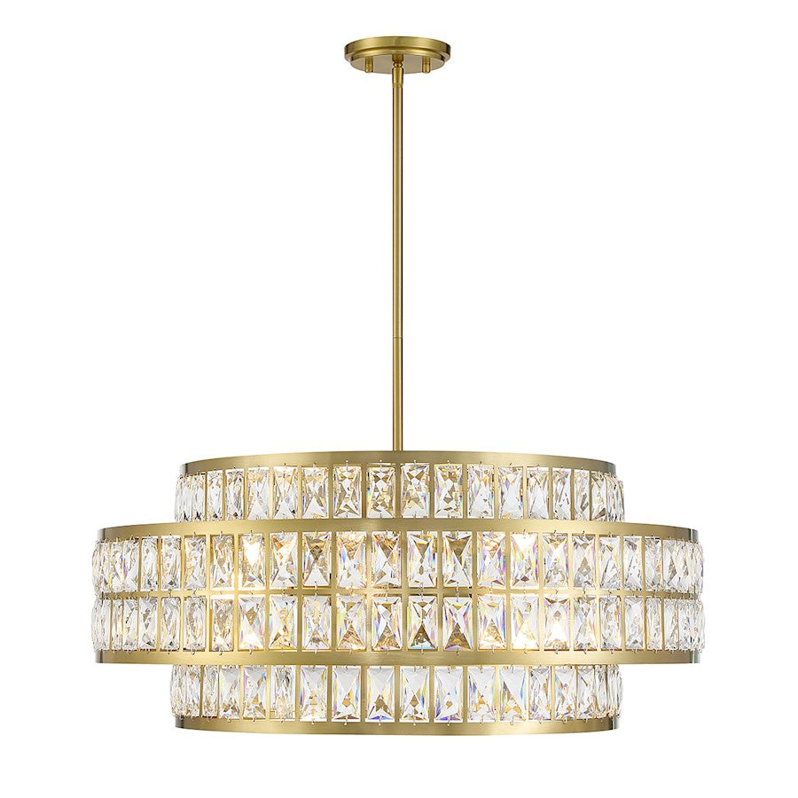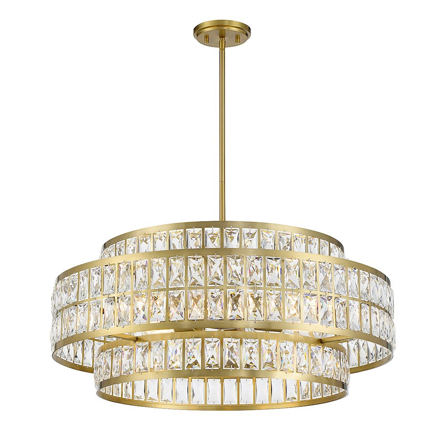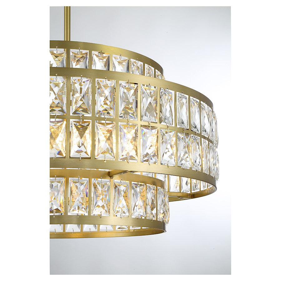 It is often said that lighting is the jewelry of the home and the Savoy House Renzo 3-light or 4-light or 6-light pendant is a perfect example of this saying. Faceted clear crystal decorates the two layers of shades, which overlap in an intriguing way and are finished in matte black or warm brass. Renzo is 16" or 22" or 28" in width and has an adjustable height ranging from 12" to 66". Comes with four 12" downrods and one 6" downrod. It uses 3 standard size bulbs of up to 60 watts per bulb (bulbs not included).