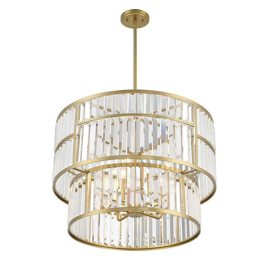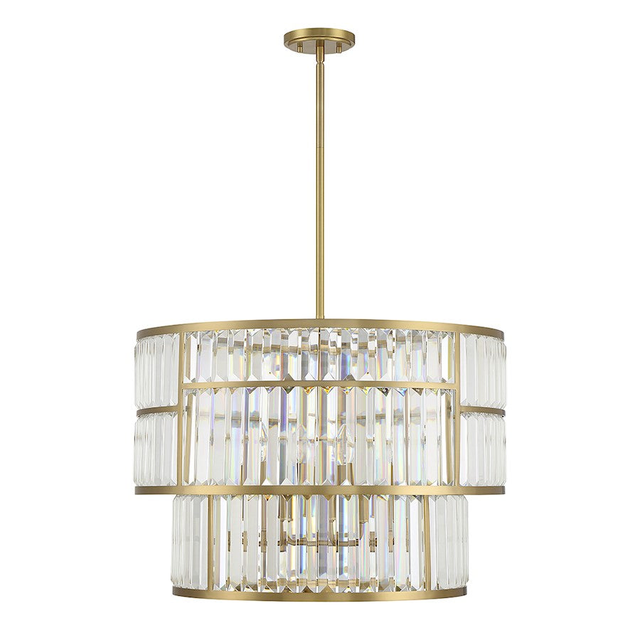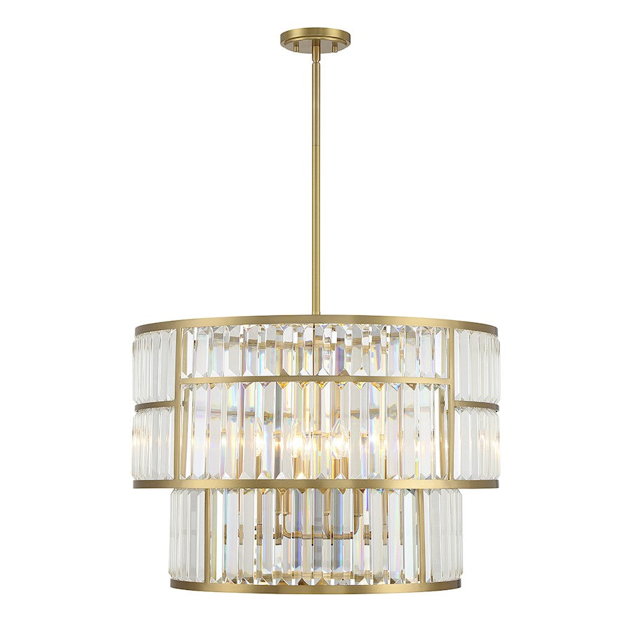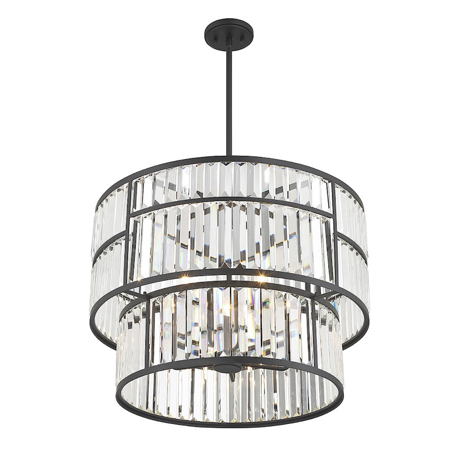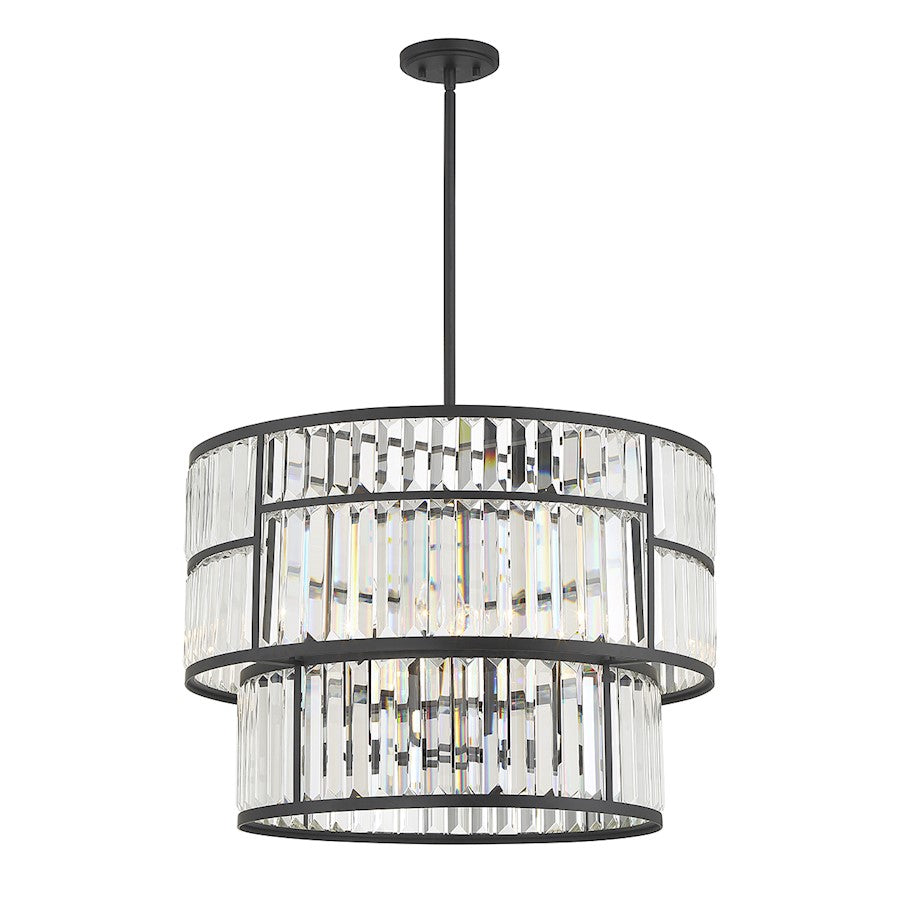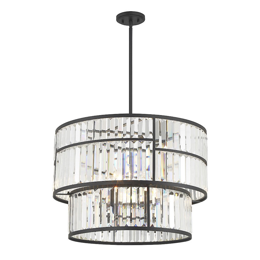 Get a highly structured, contemporary take on lighting with the stunning Savoy House Rohe 5-light pendant. Two tiers of drum-shaped shades are adorned with long, slim pieces of faceted glass to create endless shimmer and shine. Finished in matte black or warm brass. Rohe is 26" in width and has an adjustable height ranging from 19.25" to 73.25". Comes with four 12" downrods and one 6" downrod. Uses 5 candelabra size bulbs of up to 60 watts per bulb (bulbs not included).