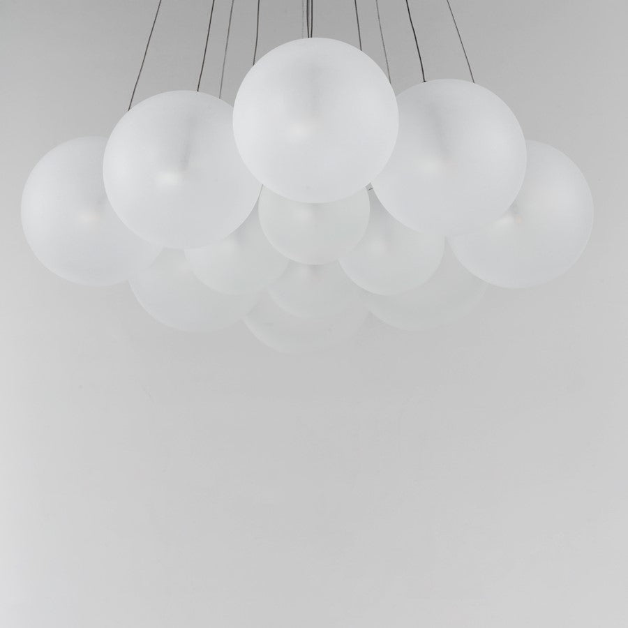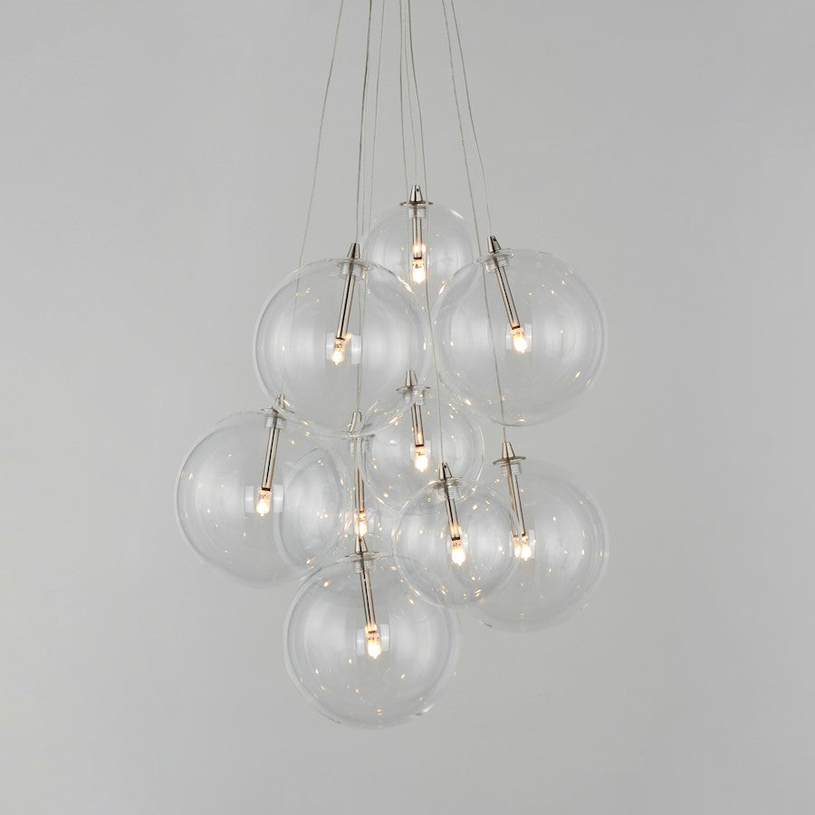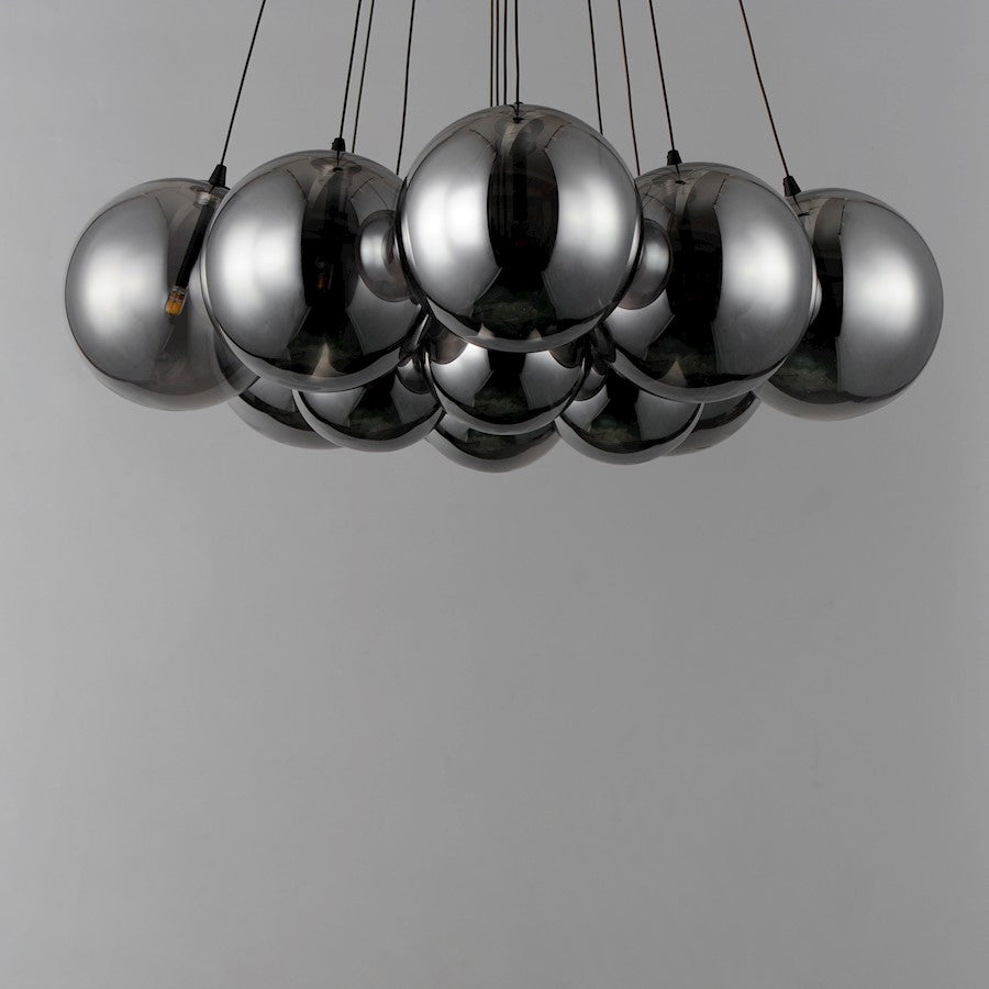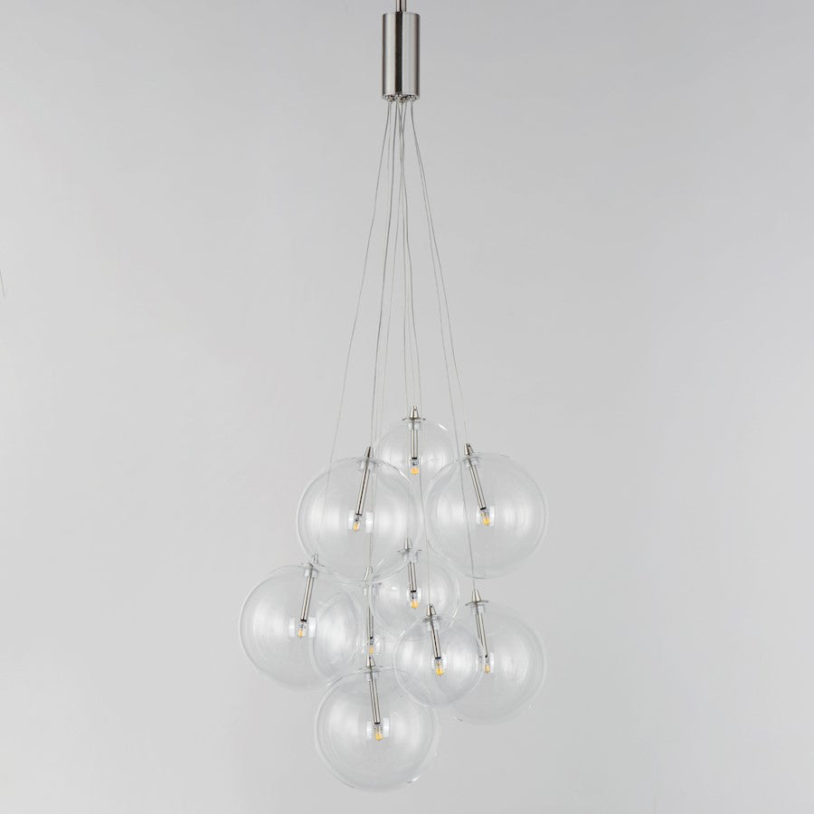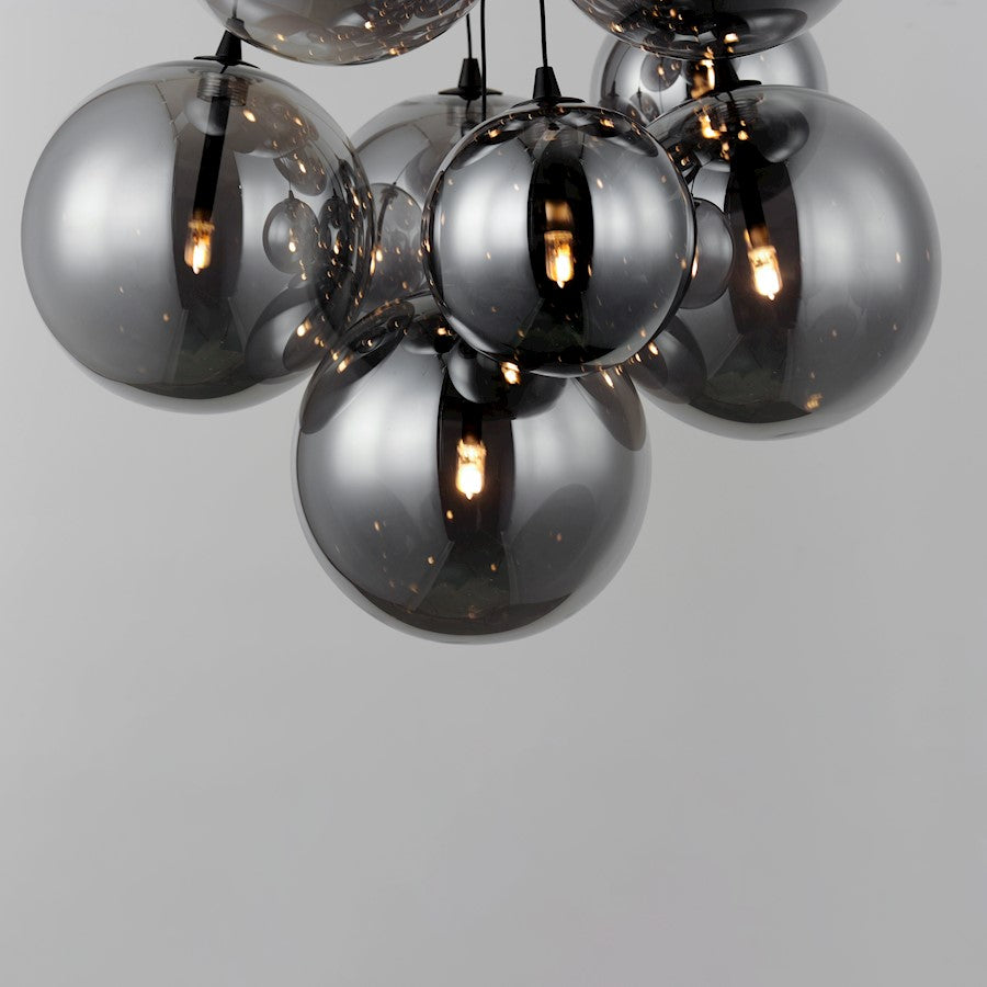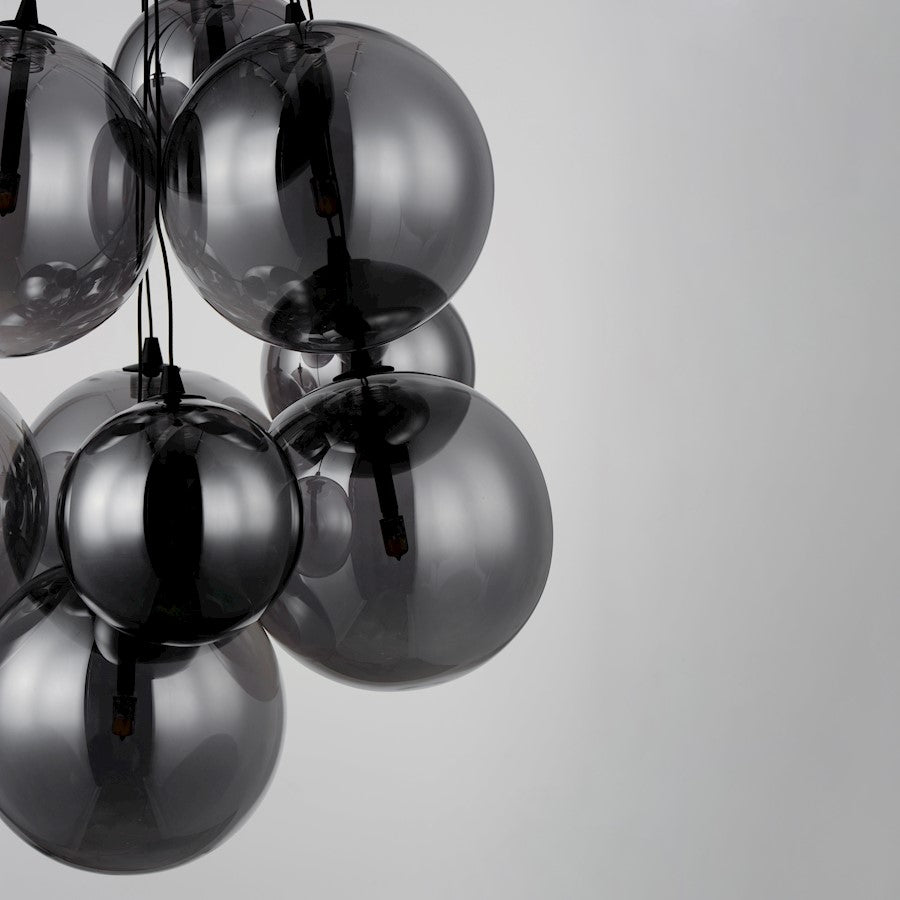 Clusters of glass globes in various sizes and color are suspended from a central point and burst outward. Configurations include a 4-Light, 9-Light, and 12-Light cluster and can be mounted close to the ceiling or included down rods to extend the height. Choose from options of Clear or Frosted glass globe clusters paired with Satin Nickel frames for an airy transitional design or be bold with Mirror Smoked glass or a varied combination of the glass including amber tinted suspended on a Matte Black frame with thin black cables. Small-scaled LED G4 lamps are included with the fixtures and centered in the glass accentuating the scale of the glass.