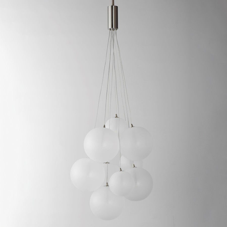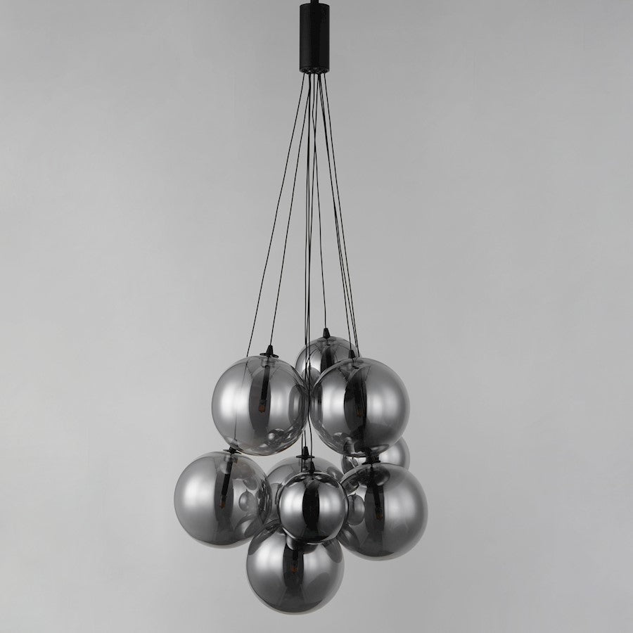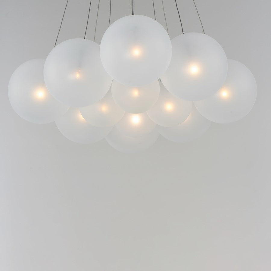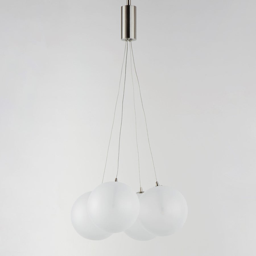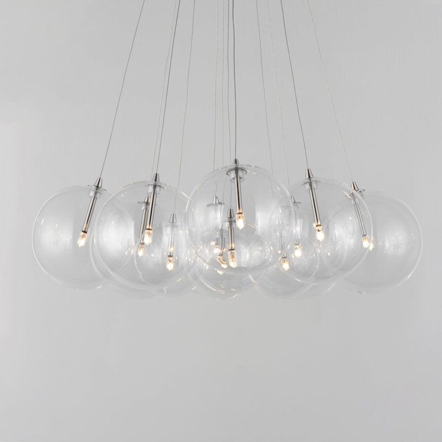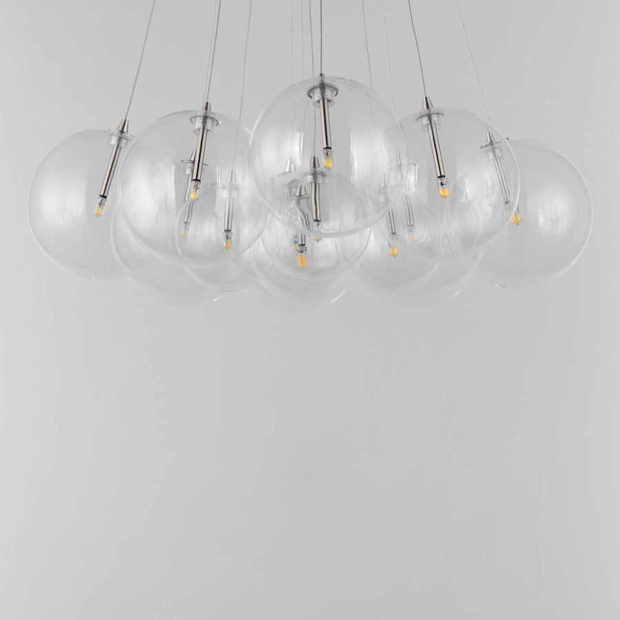 Clusters of glass globes in various sizes and color are suspended from a central point and burst outward. Configurations include a 4-Light, 9-Light, and 12-Light cluster and can be mounted close to the ceiling or included down rods to extend the height. Choose from options of Clear or Frosted glass globe clusters paired with Satin Nickel frames for an airy transitional design or be bold with Mirror Smoked glass or a varied combination of the glass including amber tinted suspended on a Matte Black frame with thin black cables. Small-scaled LED G4 lamps are included with the fixtures and centered in the glass accentuating the scale of the glass.