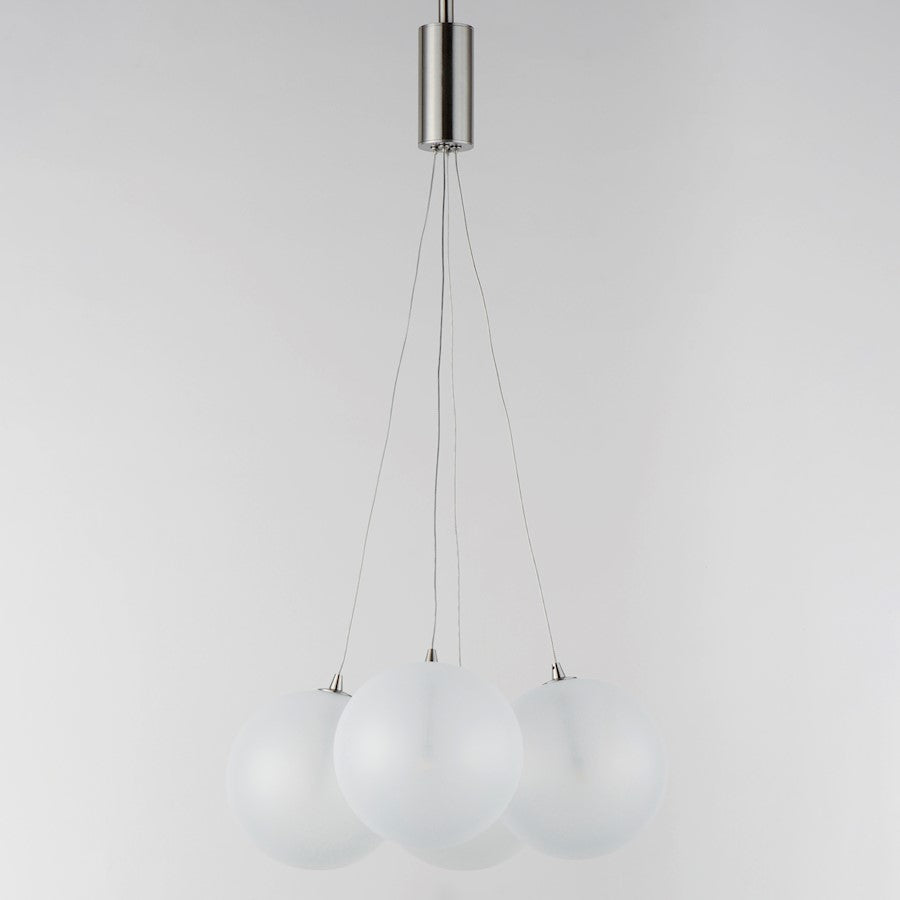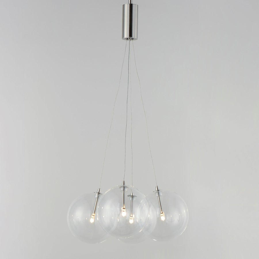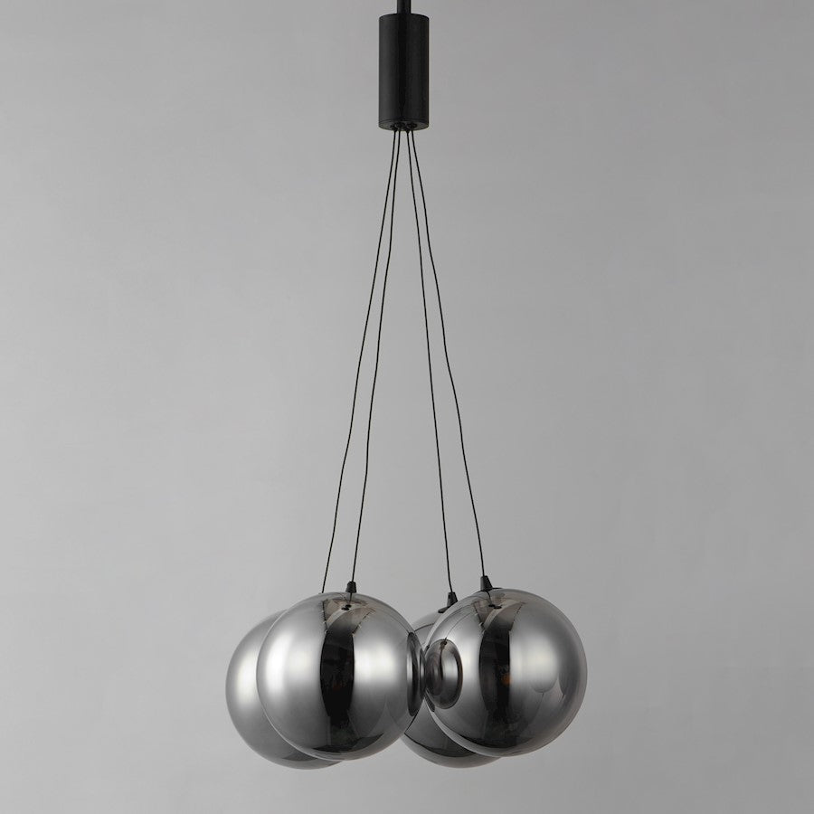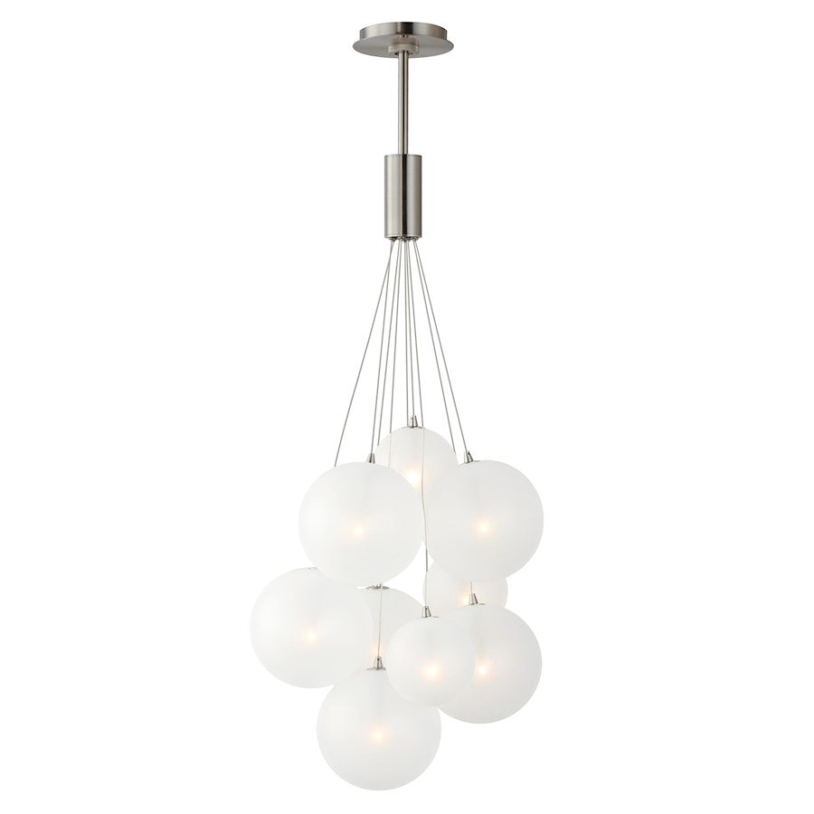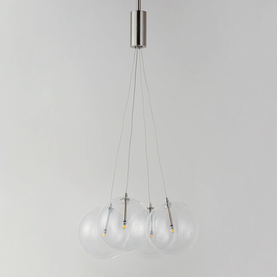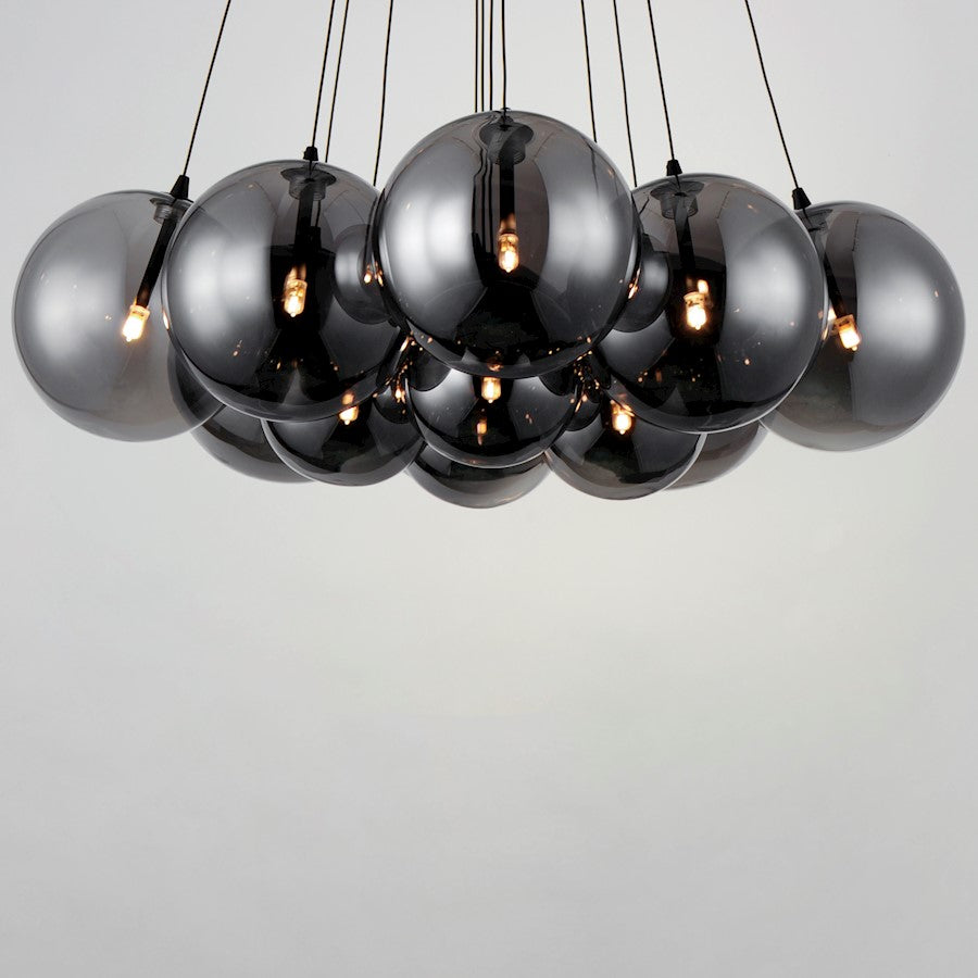 Clusters of glass globes in various sizes and color are suspended from a central point and burst outward. Configurations include a 4-Light, 9-Light, and 12-Light cluster and can be mounted close to the ceiling or included down rods to extend the height. Choose from options of Clear or Frosted glass globe clusters paired with Satin Nickel frames for an airy transitional design or be bold with Mirror Smoked glass or a varied combination of the glass including amber tinted suspended on a Matte Black frame with thin black cables. Small-scaled LED G4 lamps are included with the fixtures and centered in the glass accentuating the scale of the glass.