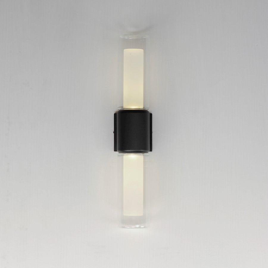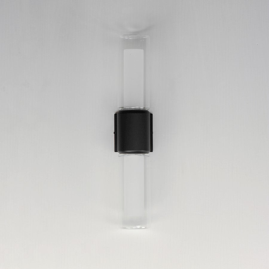 Dual Cylinder glass shades diffuse LED light bulbs concealed within rounded caps in Black powder coat. The single sconce is wet located with intention to be used outdoors, while the complementary 3-Light wall sconce is perfect for use in transitional to more modern bathrooms. The LED lamp provided is T24 JA8 compliant and Energy Star listed.