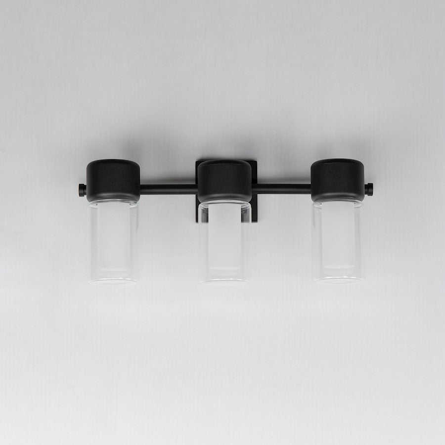 Dual Cylinder glass shades diffuse LED light bulbs concealed within rounded caps in Black powder coat. The single sconce is wet located with intention to be used outdoors, while the complementary 3-Light wall sconce is perfect for use in transitional to more modern bathrooms. The LED lamp provided is T24 JA8 compliant and Energy Star listed.