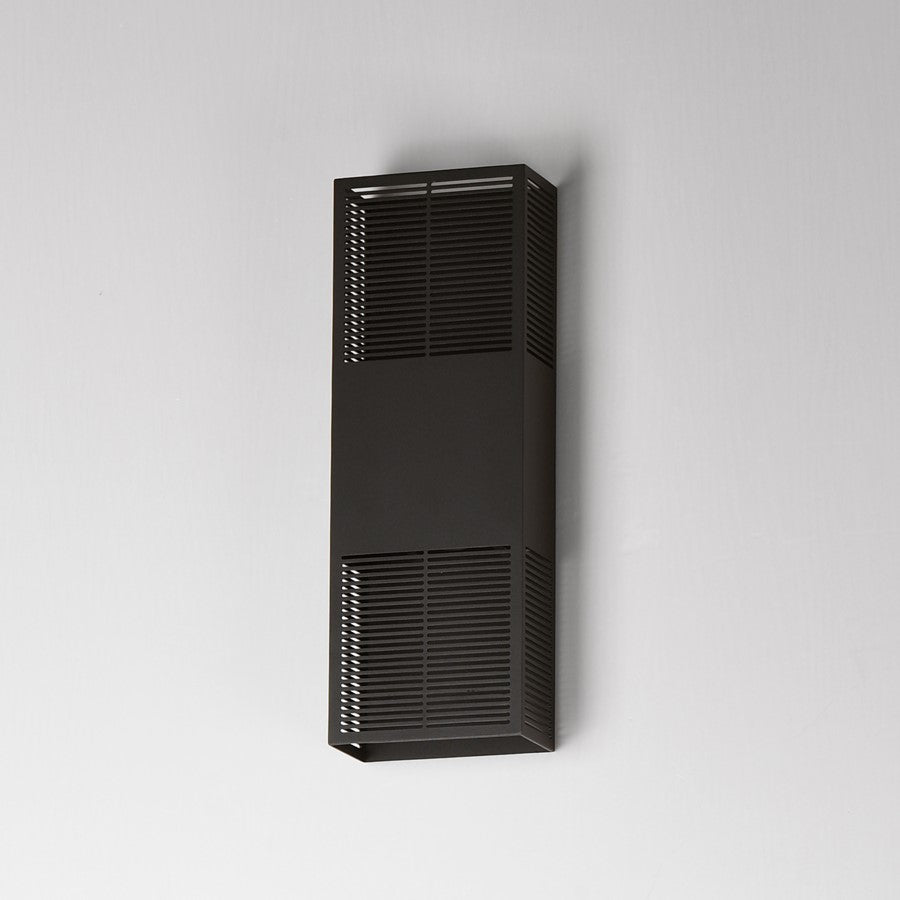 An array of precise slits are stacked in two columns on rectangular shade forms of various sizes. Housed in a blocked out space is a recessed LED light source that casts a filigree that radiate onto the surface surrounding the sconce making a dazzling display from the simple geometrical frame. Available in Matte Black or Architectural Bronze, the LED is a neutral 3000K.