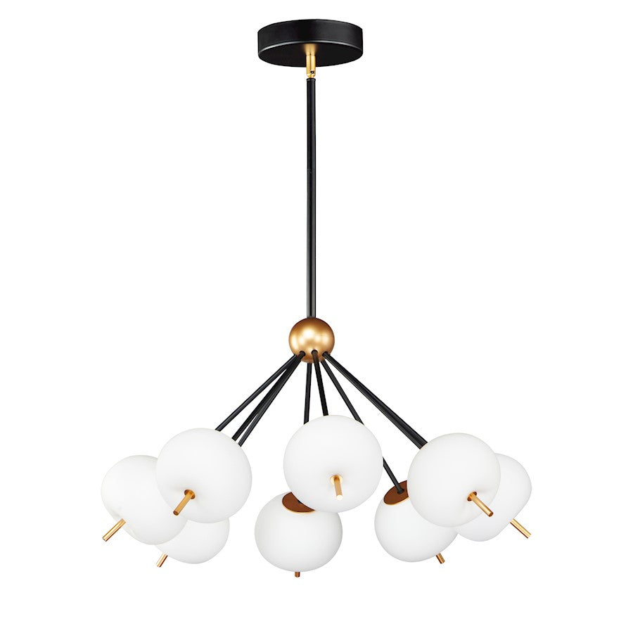 Inspired by contemporary Euro design, this collection features Satin White cased glass fonts suspended by rods of Gold with Black accents. Powered by integrated LED modules, light is directed downward in a soft and diffused manner.