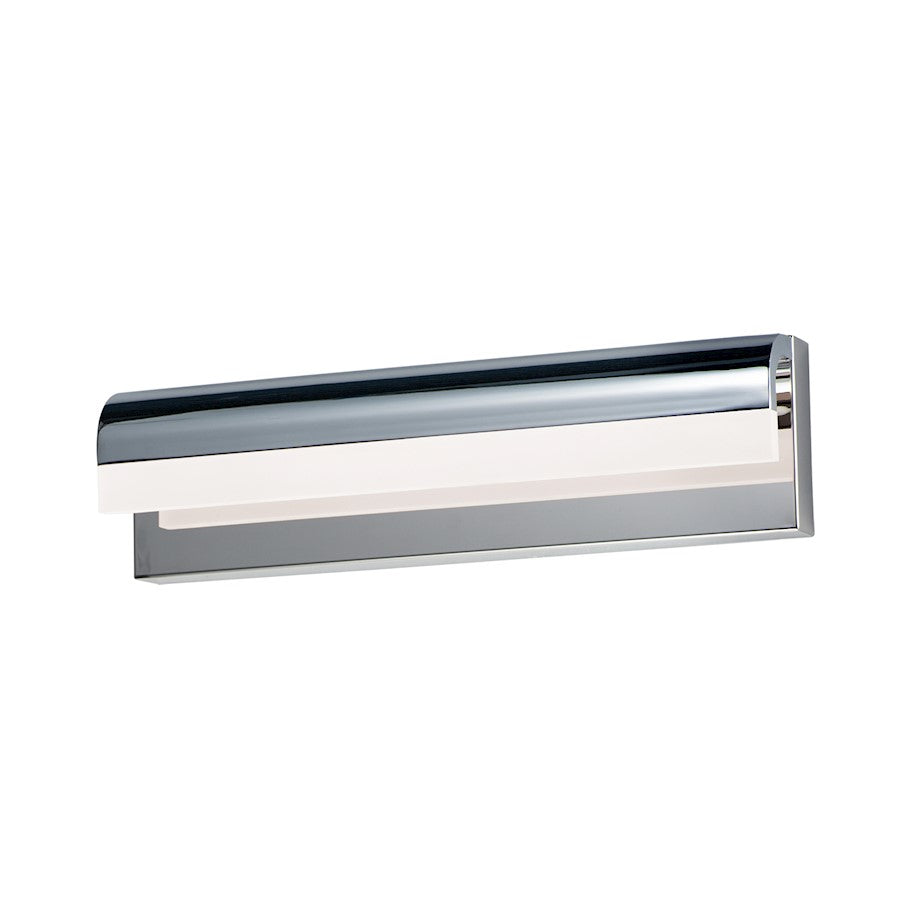 An aluminum frame of Polished Chrome or Black, cascades downward and supports a frosted acrylic diffuser which nicely diffuses the light from the LED enclosed. A perfect complement to the similar bath hardware found in many homes today.